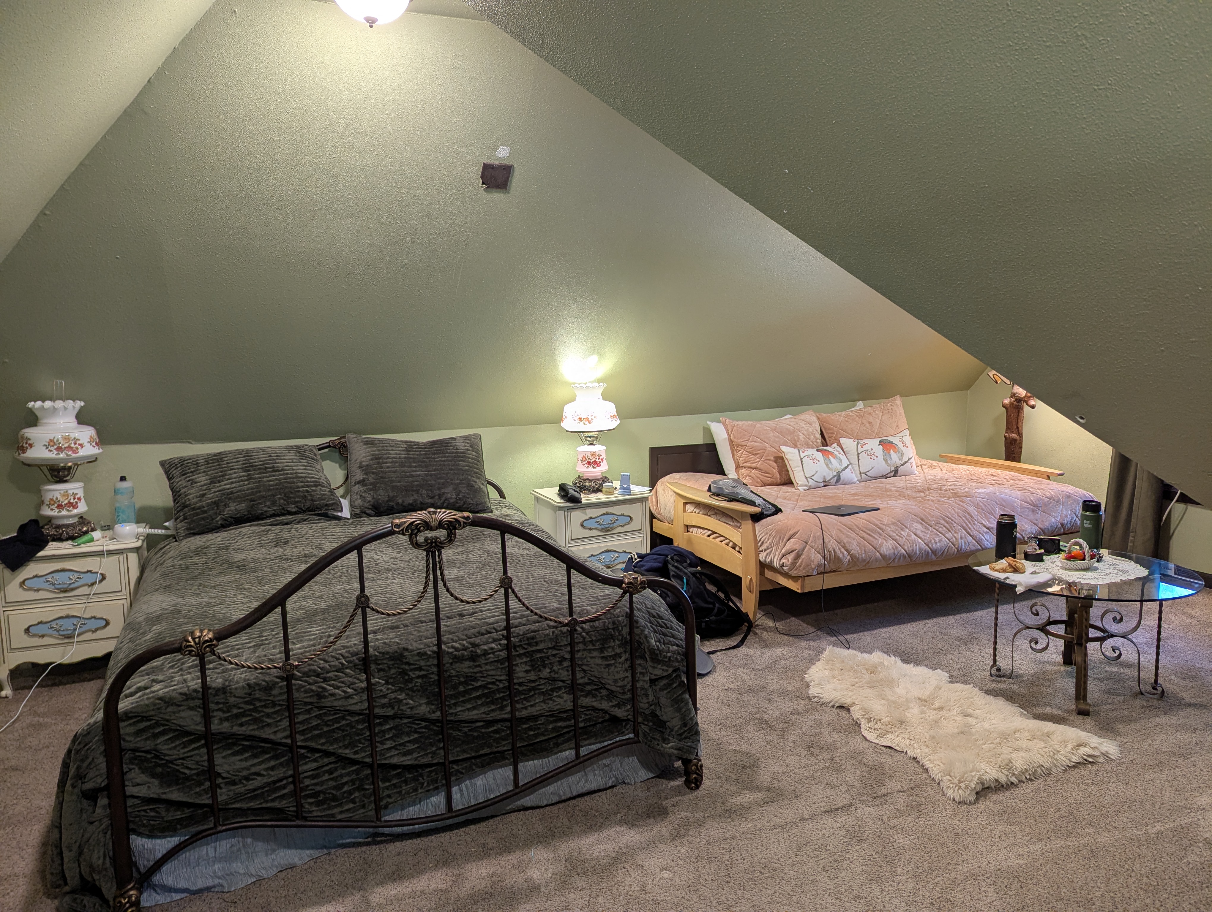 I also described it as daringly impractical, as there were so many concussion hazards. Eric said the whole room was a Dutch angle, and took my picture ducking under the attic roof.