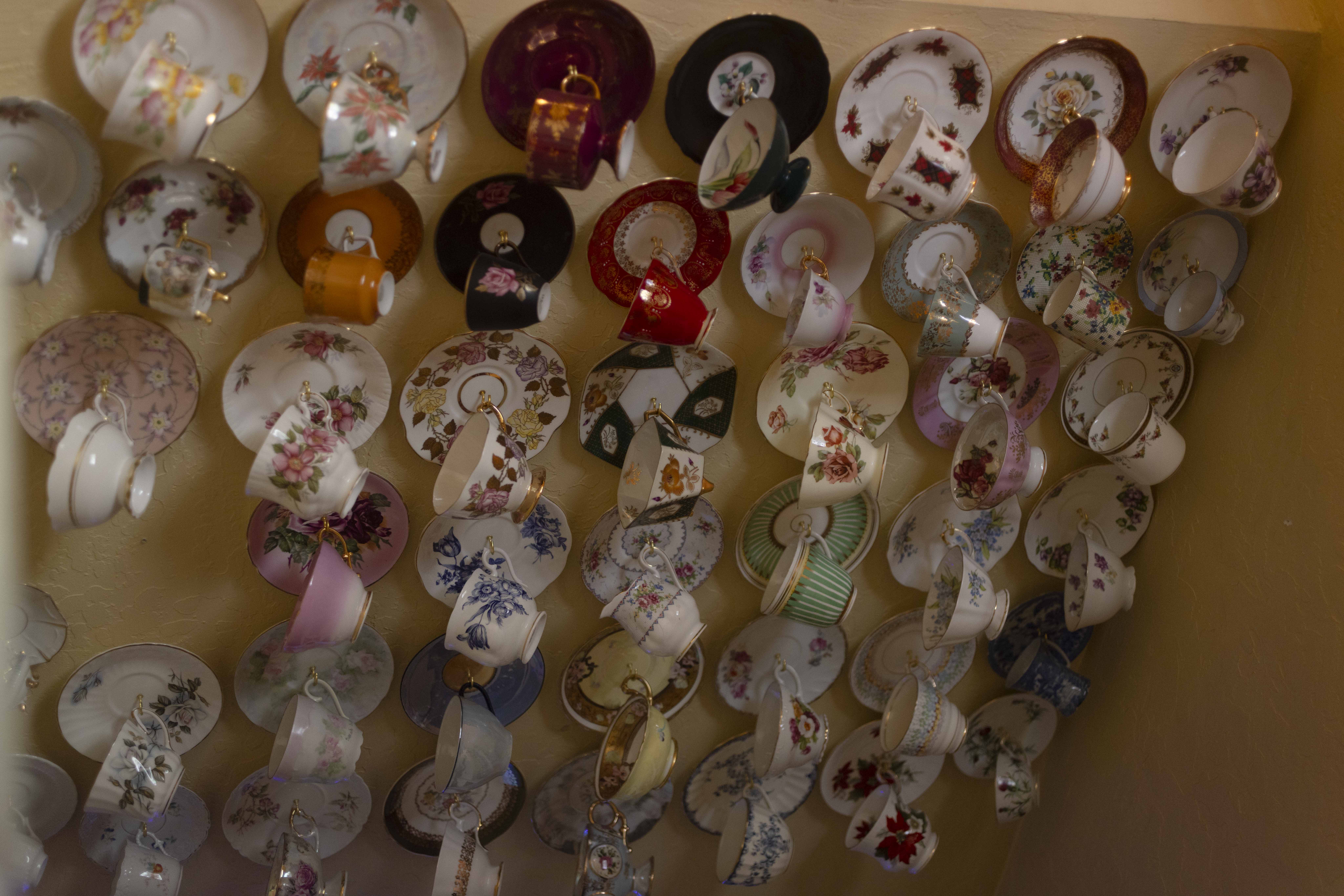 An array of teacups on the way from the entrance down to the kitchen and dining area.