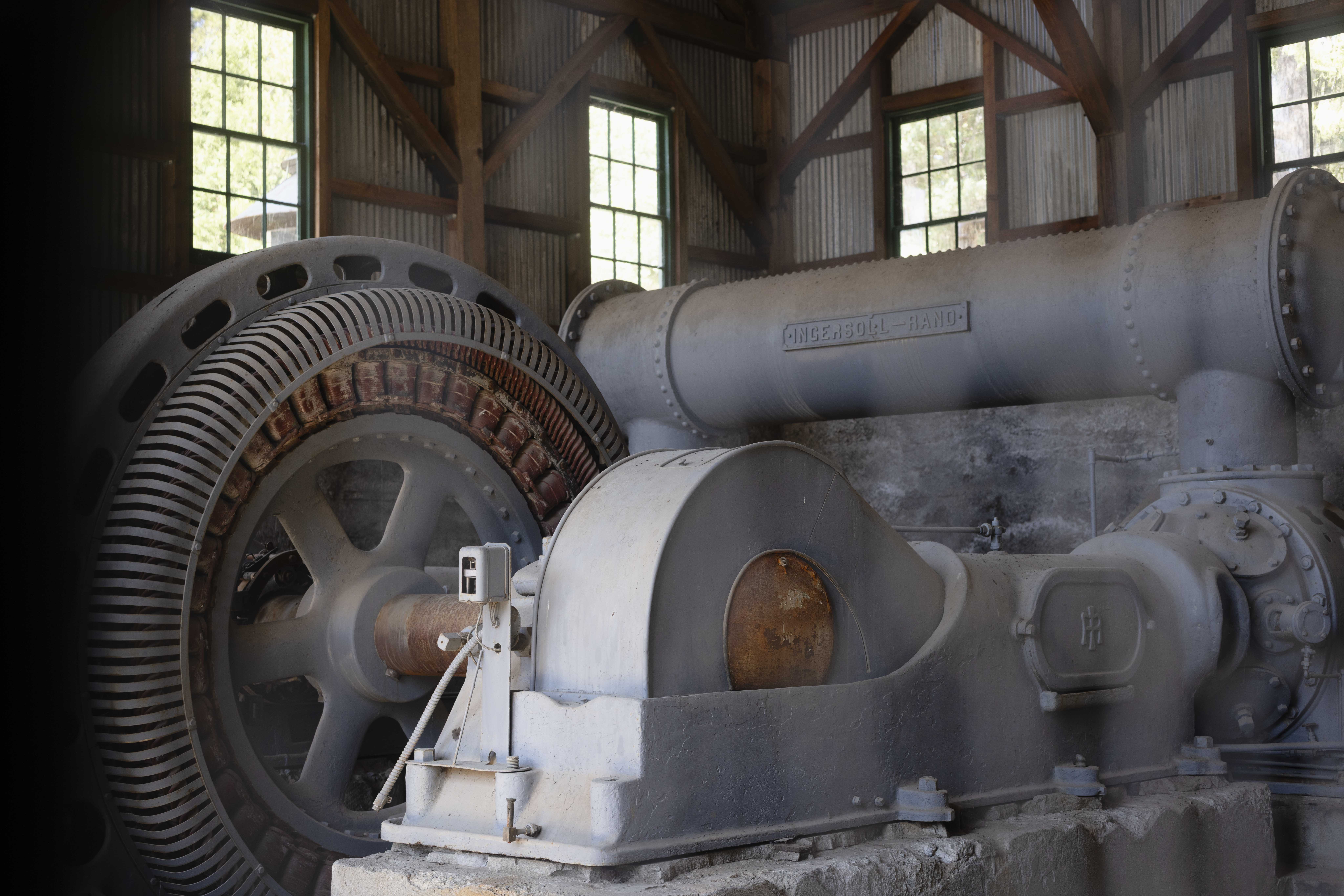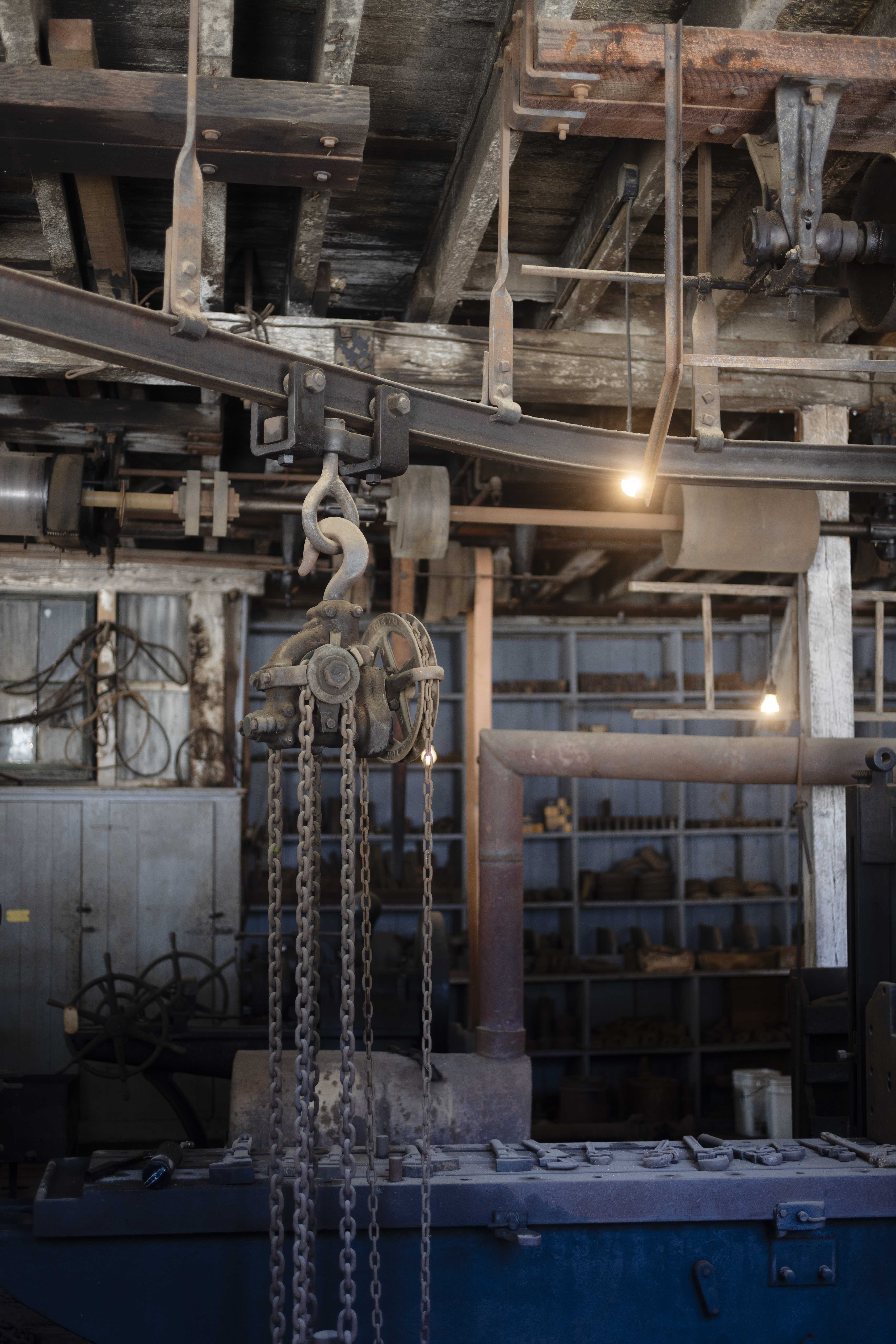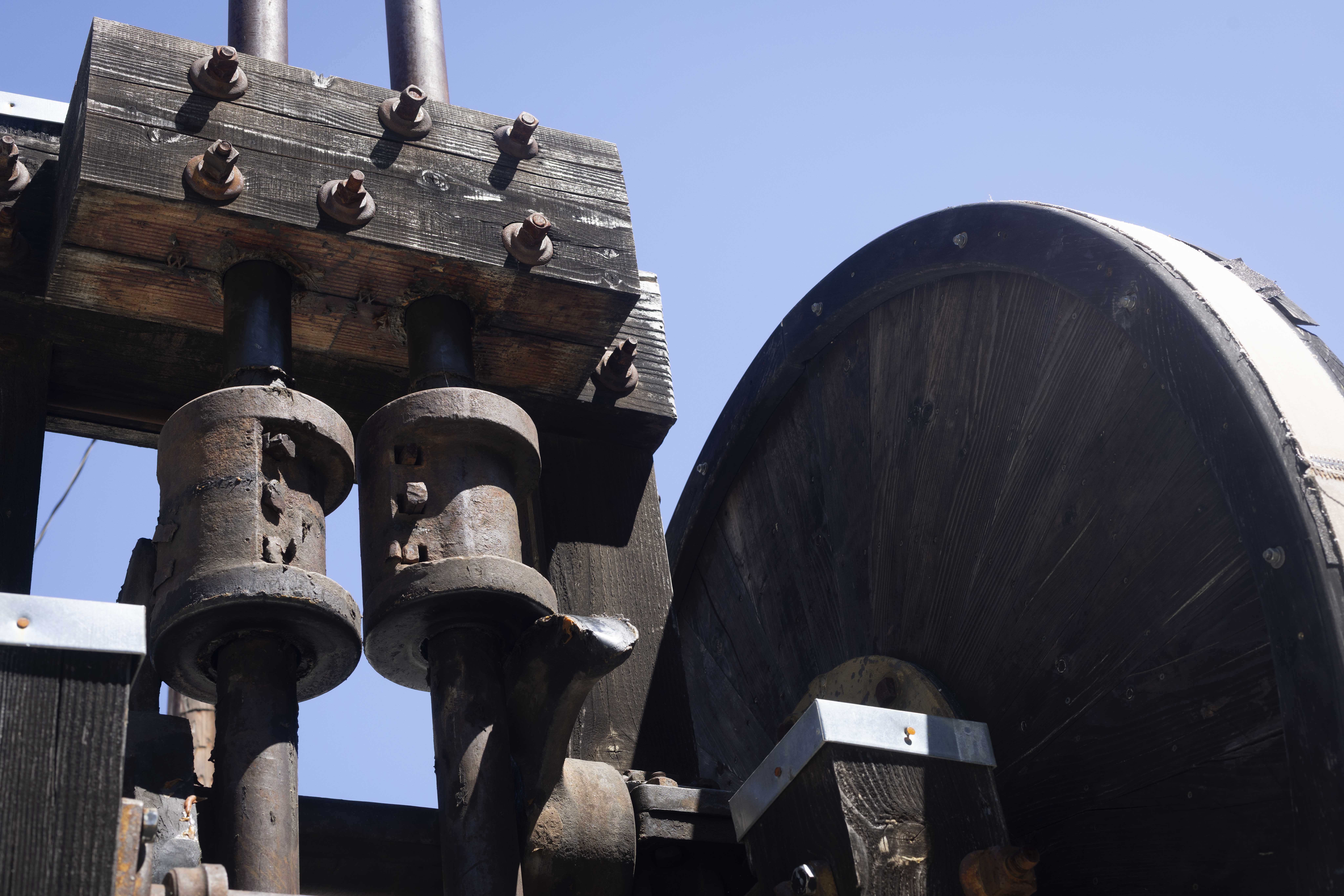 Stamping machinery. This machine was used to crush ore, which was then combined with mercury-coated copper and rinsed to wash away impurities and separate the gold.