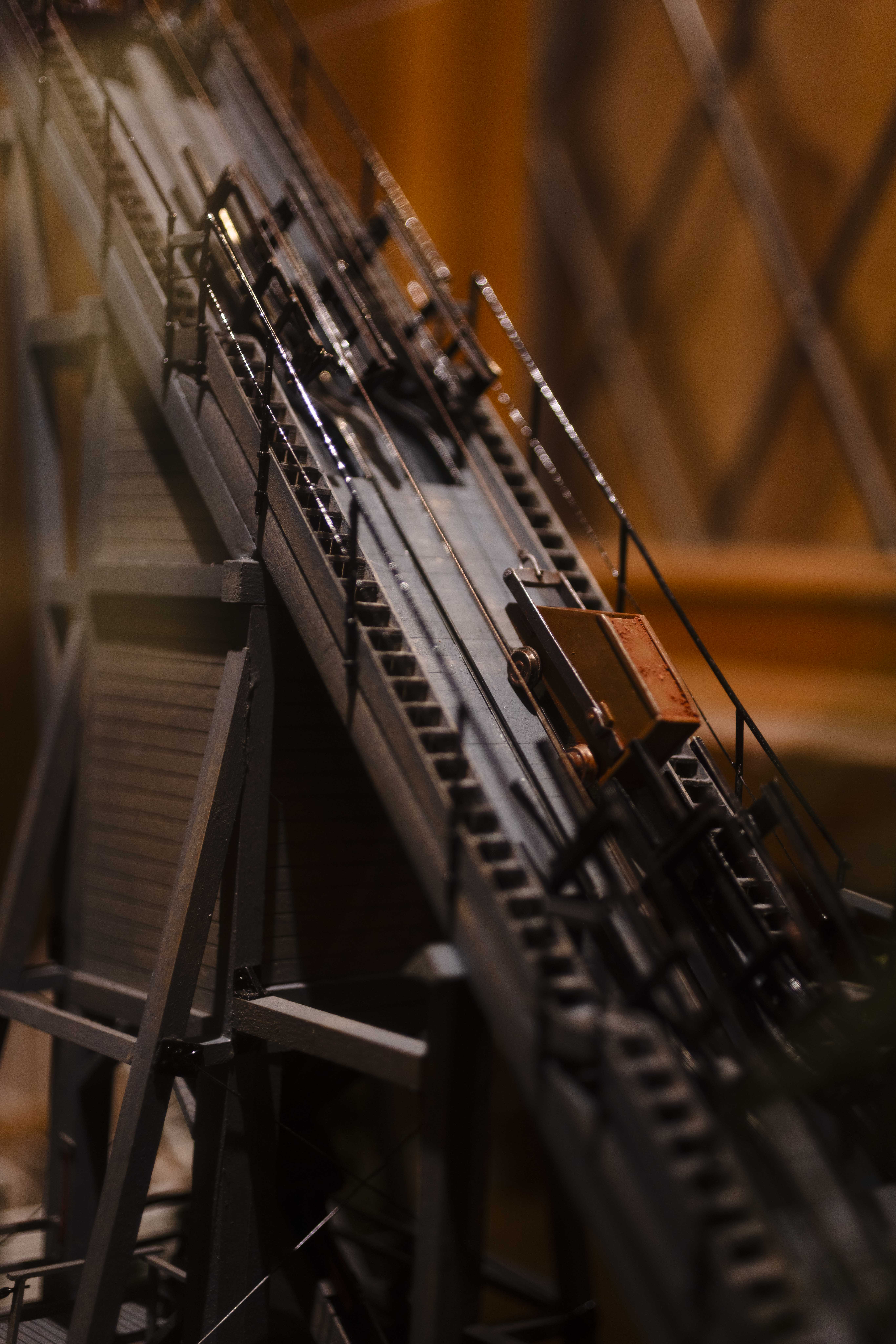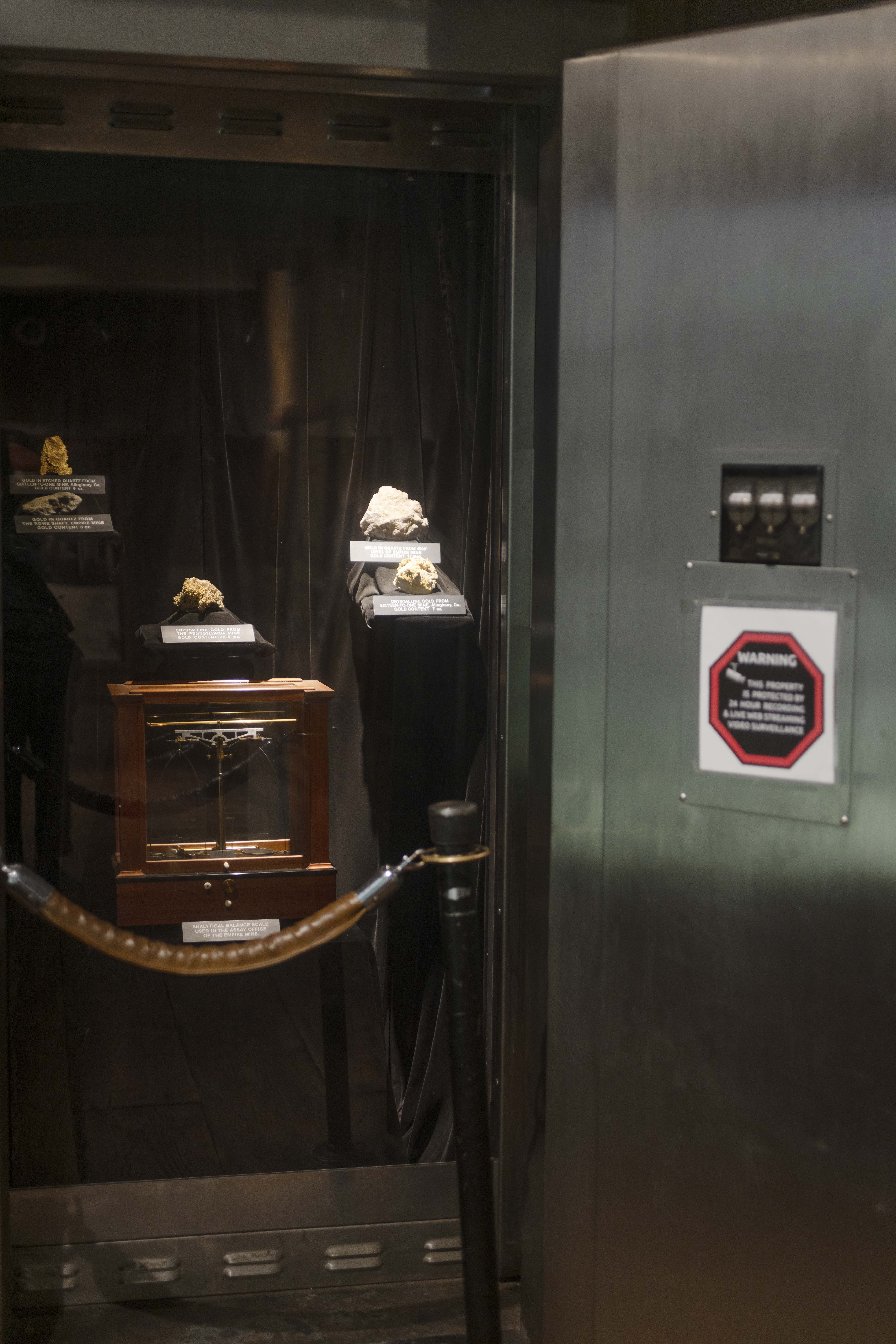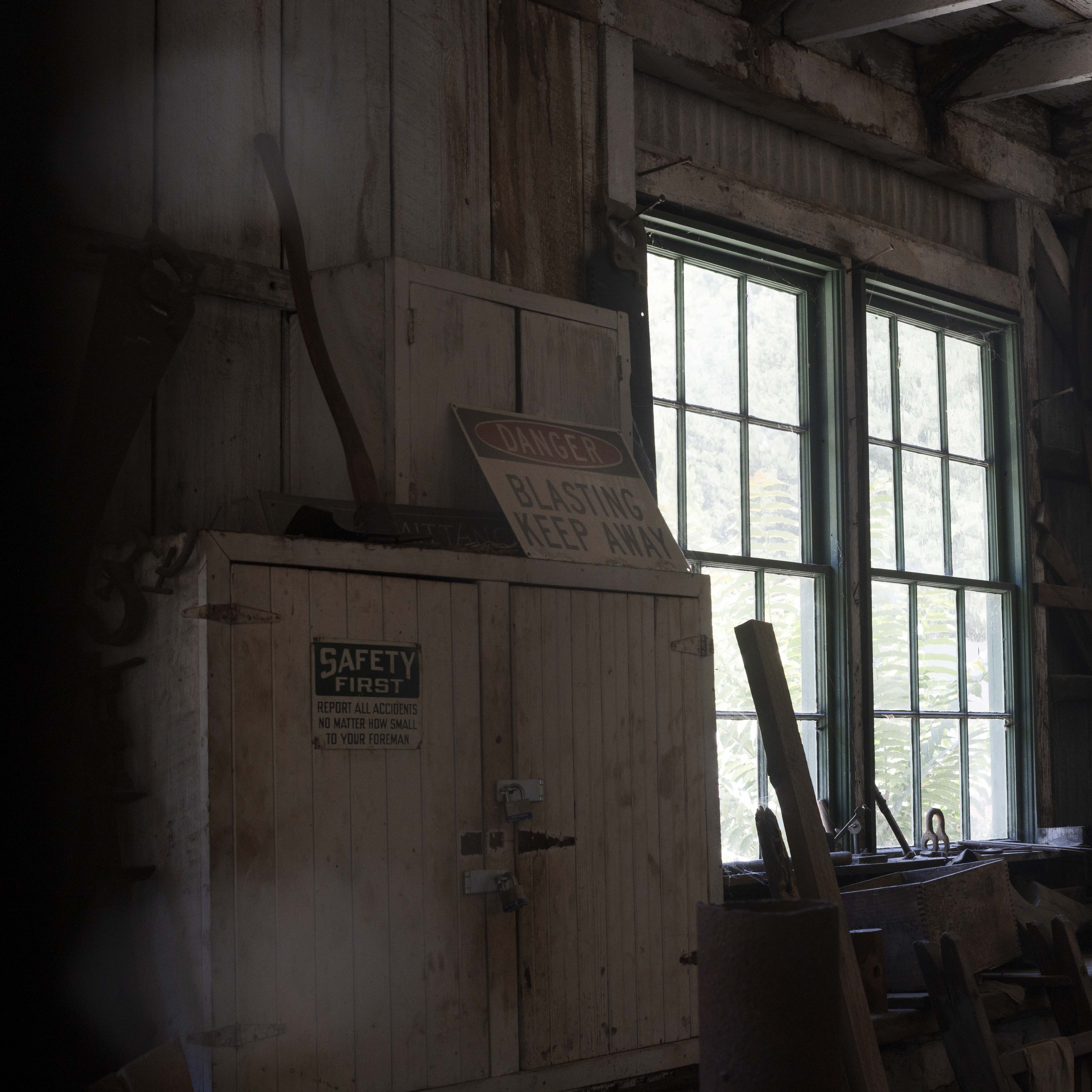 Stamping machinery. This machine was used to crush ore, which was then combined with mercury-coated copper and rinsed to wash away impurities and separate the gold.