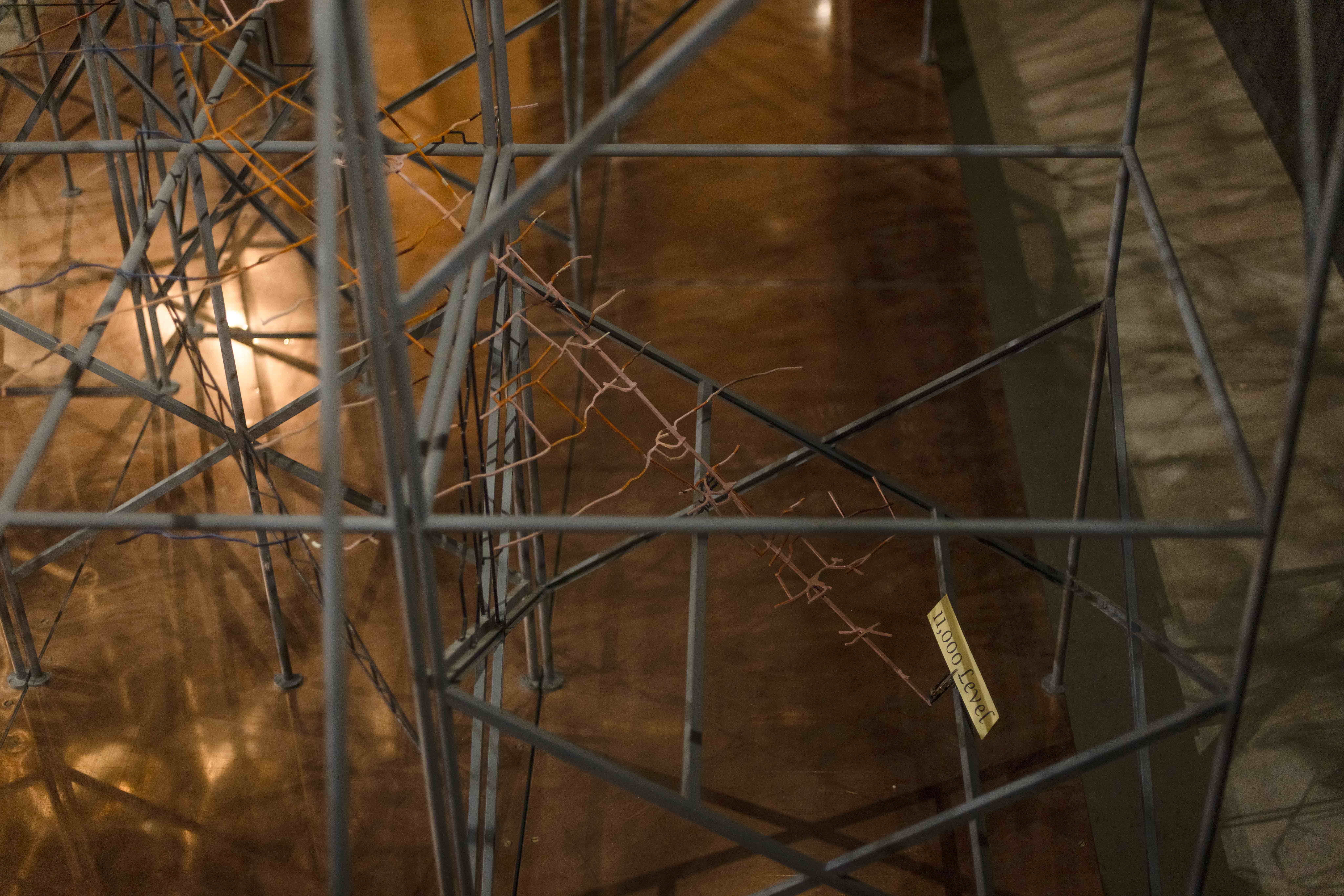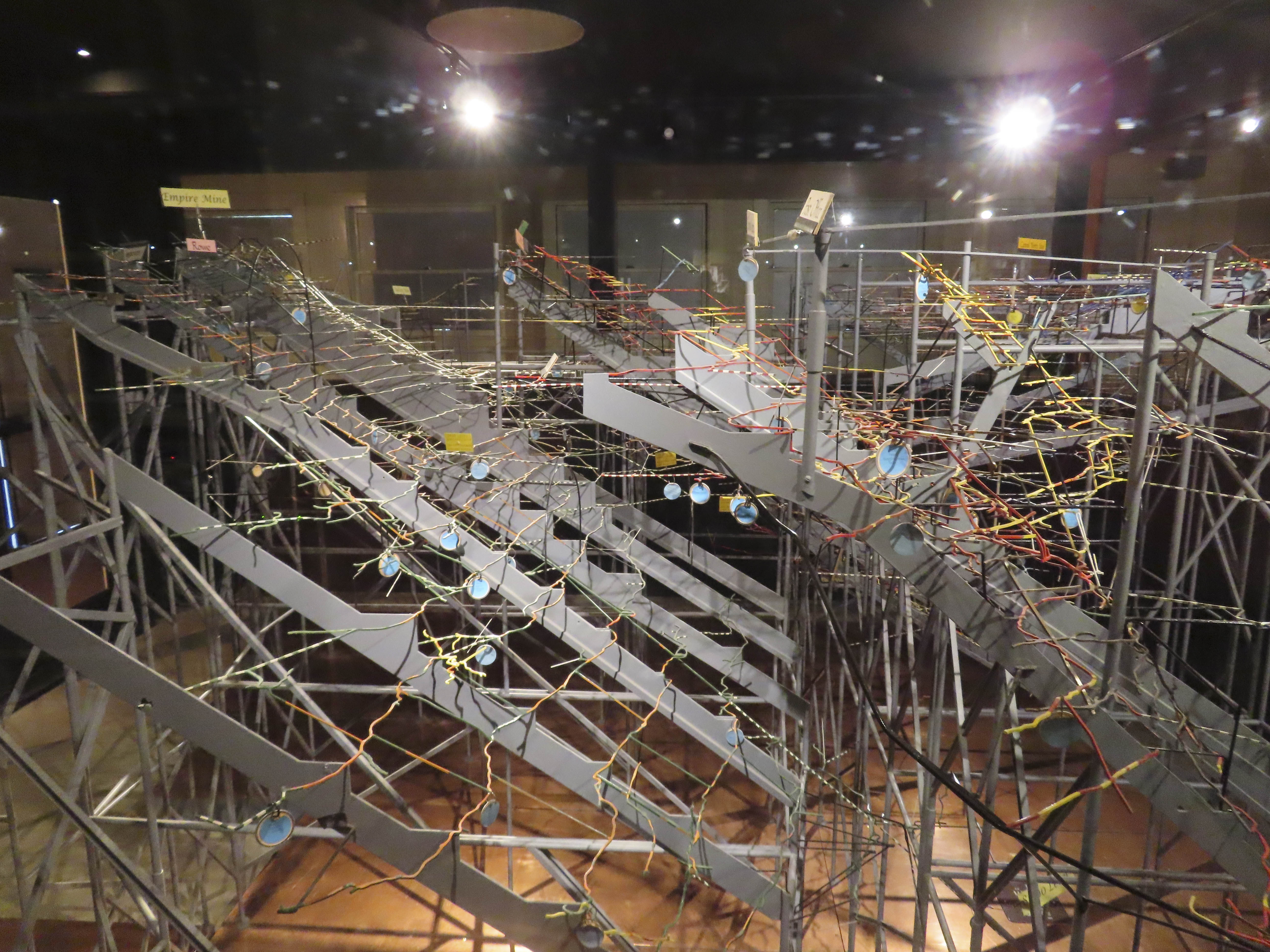 It is difficult to make the abstraction in looking at the model, but the gray pieces are only framing to hold the model in vertical space. The actual tunnels of the mine are represented by the colored parts, which are color-coded for their levels of ore production. The scale of the model is 80 feet:1 inch--the mine is enormous. Note that the deepest parts, depicted here, were down 11,000 feet/3,354 meters. The model had been a top-secret project among the owners and operators of the mine.