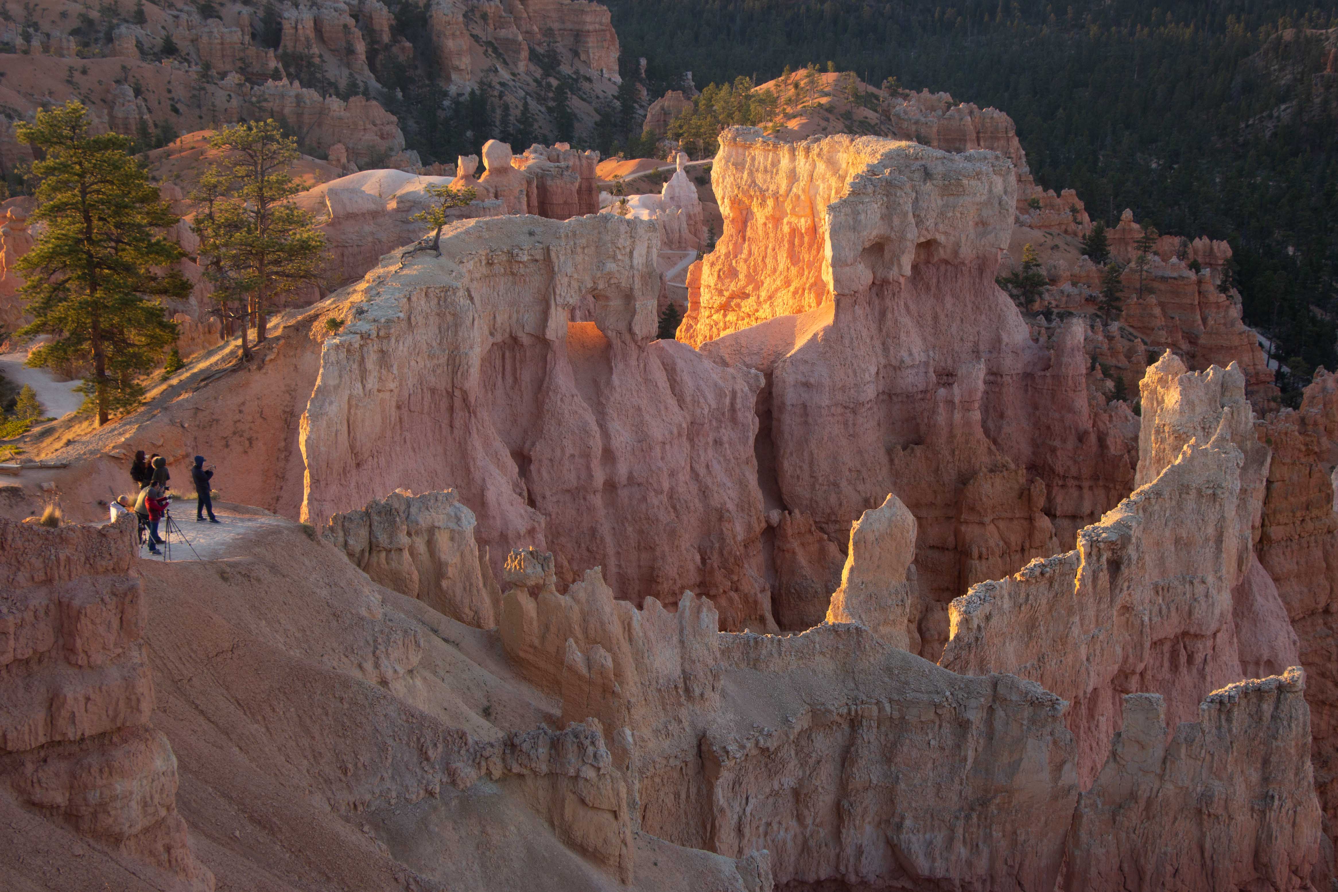 We did not, however, arrive at Sunrise Point in time for the most fantastically optimal light. While we had been the first photographers at Grand Canyon and I was the only photographer at Zion, there was a whole photography workshop already there at Bryce, hard at work. The instructor was giving good advice, such as, check your ISO, make sure you turn off IS when you're on the tripod, etc. They actually left Sunrise Point before the actual sunrise, because by that time, the area was full of the selfie-stick crowd. It makes me wish the Park Service wouldn't give lookouts names like "Sunrise Point" and "Sunset Point."