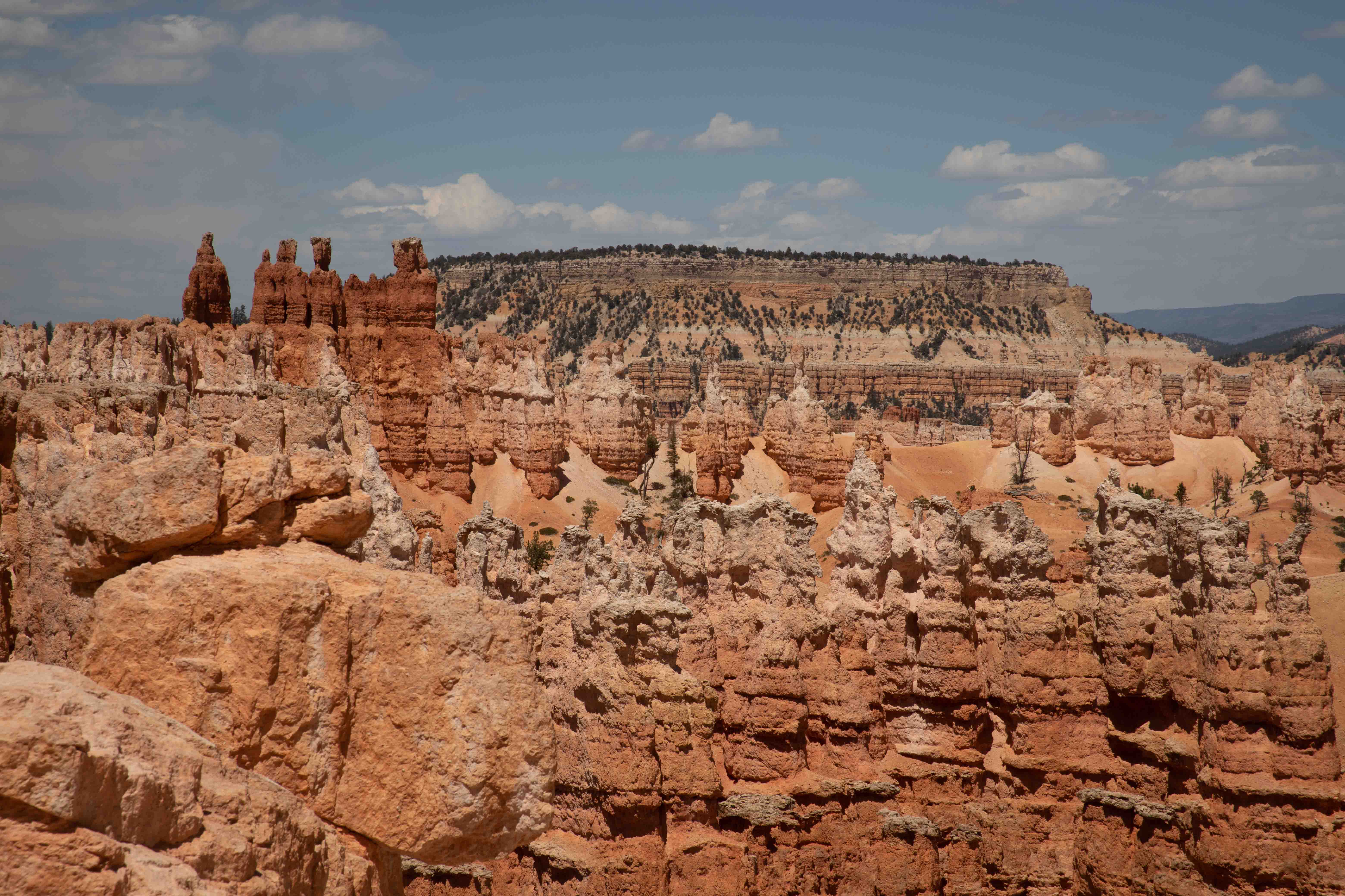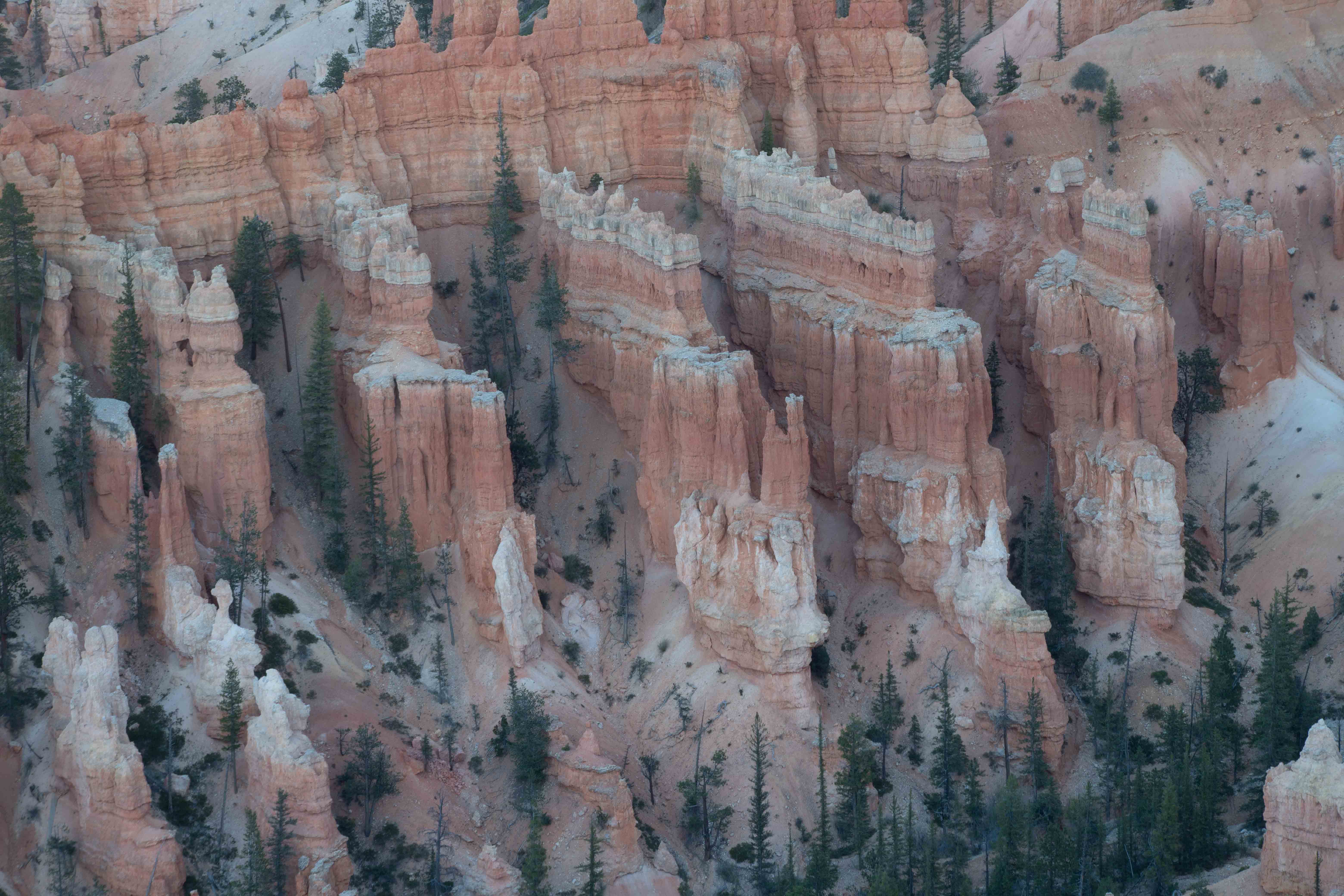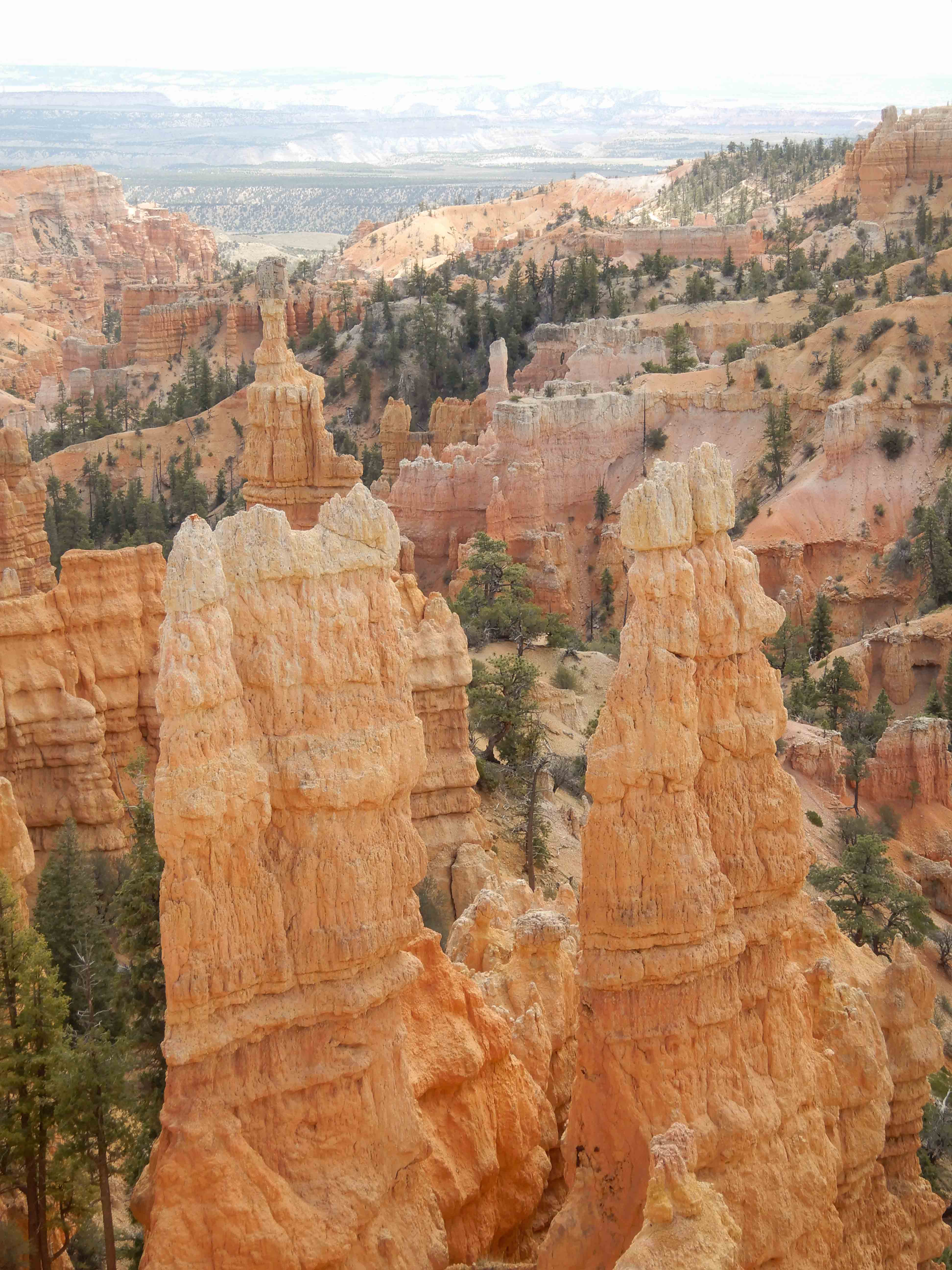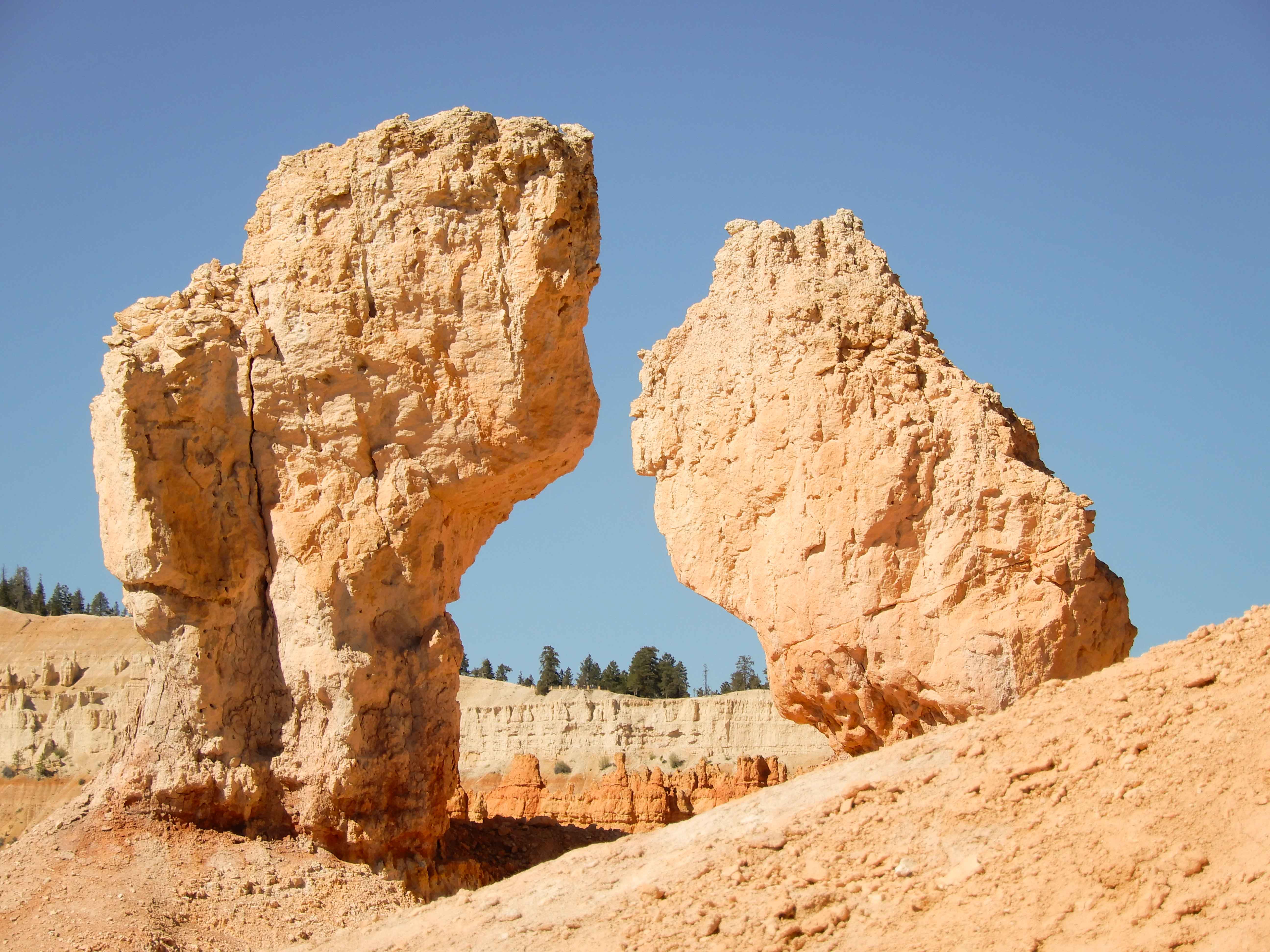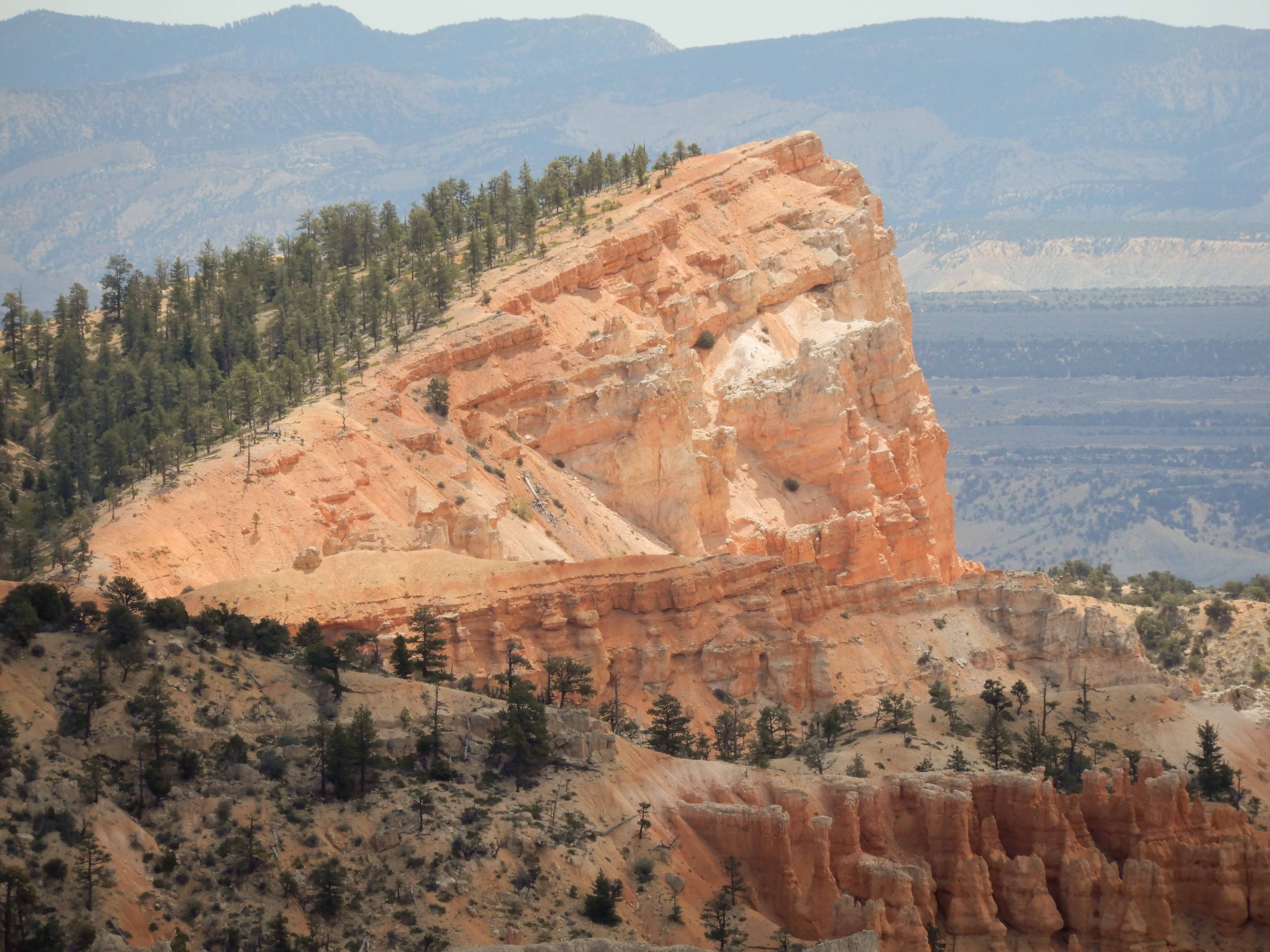 Now...about these hoodoos for which Bryce is famed. These rocks are part of the deep orange Claron Formation, which is the top "stair" of the Grand Staircase of the Escalante. Their story is not simple. The first part involves plate tectonics, stresses on the rock caused by the uplift of the Rocky Mountains to the east, the uplift of the Colorado Plateau itself, and the present-day stretching out of the Basin and Range province to the west. Then the Claron Formation was weathered along places where tectonic forces had already fractured the rock. Freeze-thaw cycles accelerate the weathering of rock at altitude. Third, this weathering process pushed deep into the rock, creating the area's famous slot canyons as well as the hoodoos. The rock has eroded more along fractures, and the many different layers of rock preserved in this area are eroding at different rates. These hoodoos are truly unique because they were caused by such an unusual confluence of geologic processes. [SOURCE: Geology Unfolded: An Illustrated Guide to the Geology of Utah's National Parks by Thomas H. Morris, Scott M. Ritter, and Dallin P. Laycock]