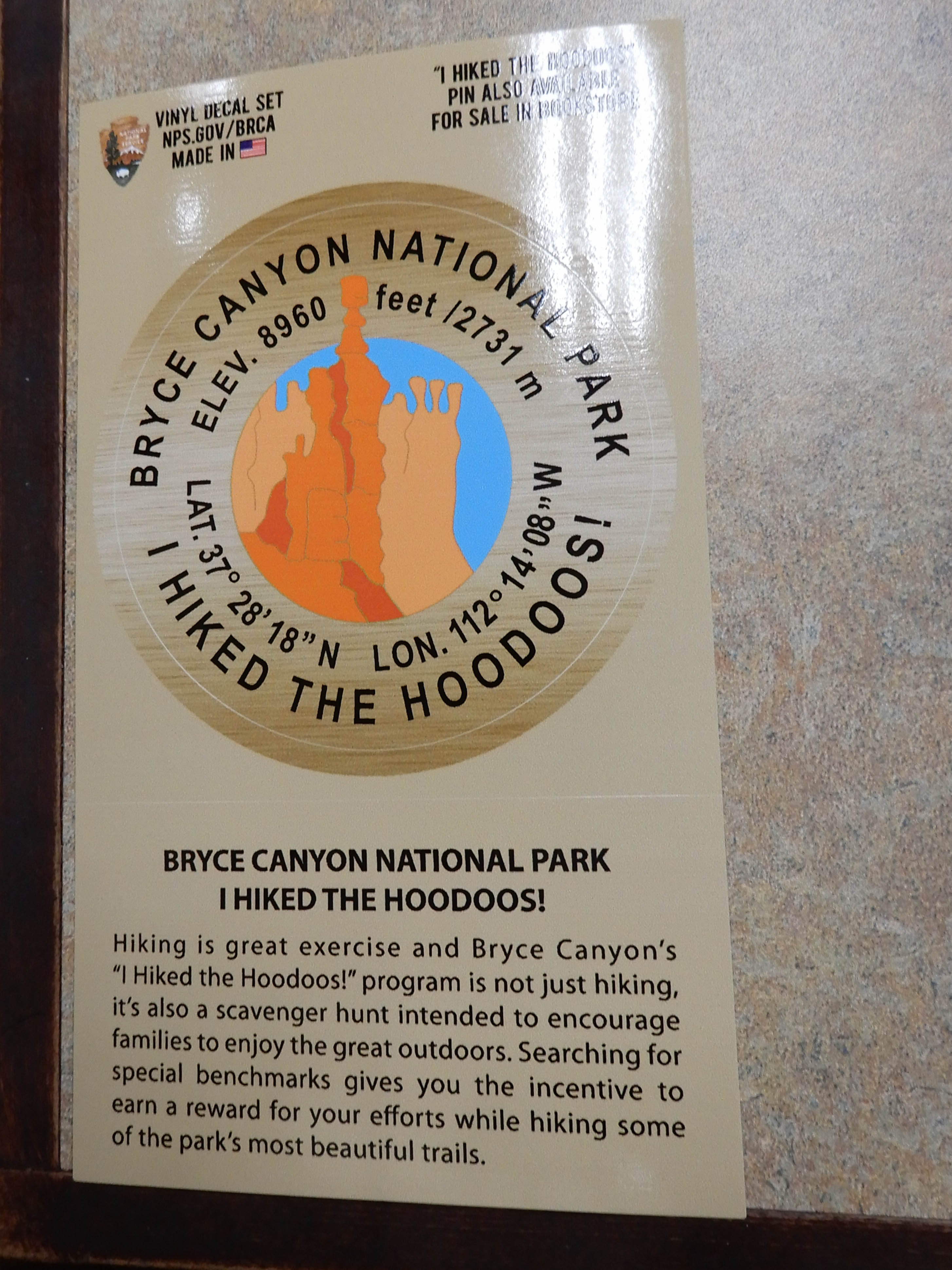 The hikes in Bryce have interpretive signs in iconic places with "I Hiked the Hoodoos!" benchmarks. The Park Service has a Junior Ranger program where, if you take your picture with three of the signs and bring them to the ranger in the Visitor Center, you can earn a small award. It's a little like geocaching. We thought it might just be for children, but we found five benchmarks and took our pictures with all of them. When went to see the ranger in the morning, she told us that all of the Junior Ranger programs were for adults as well, and gave us our awards, "I Hiked the Hoodoos!" stickers.