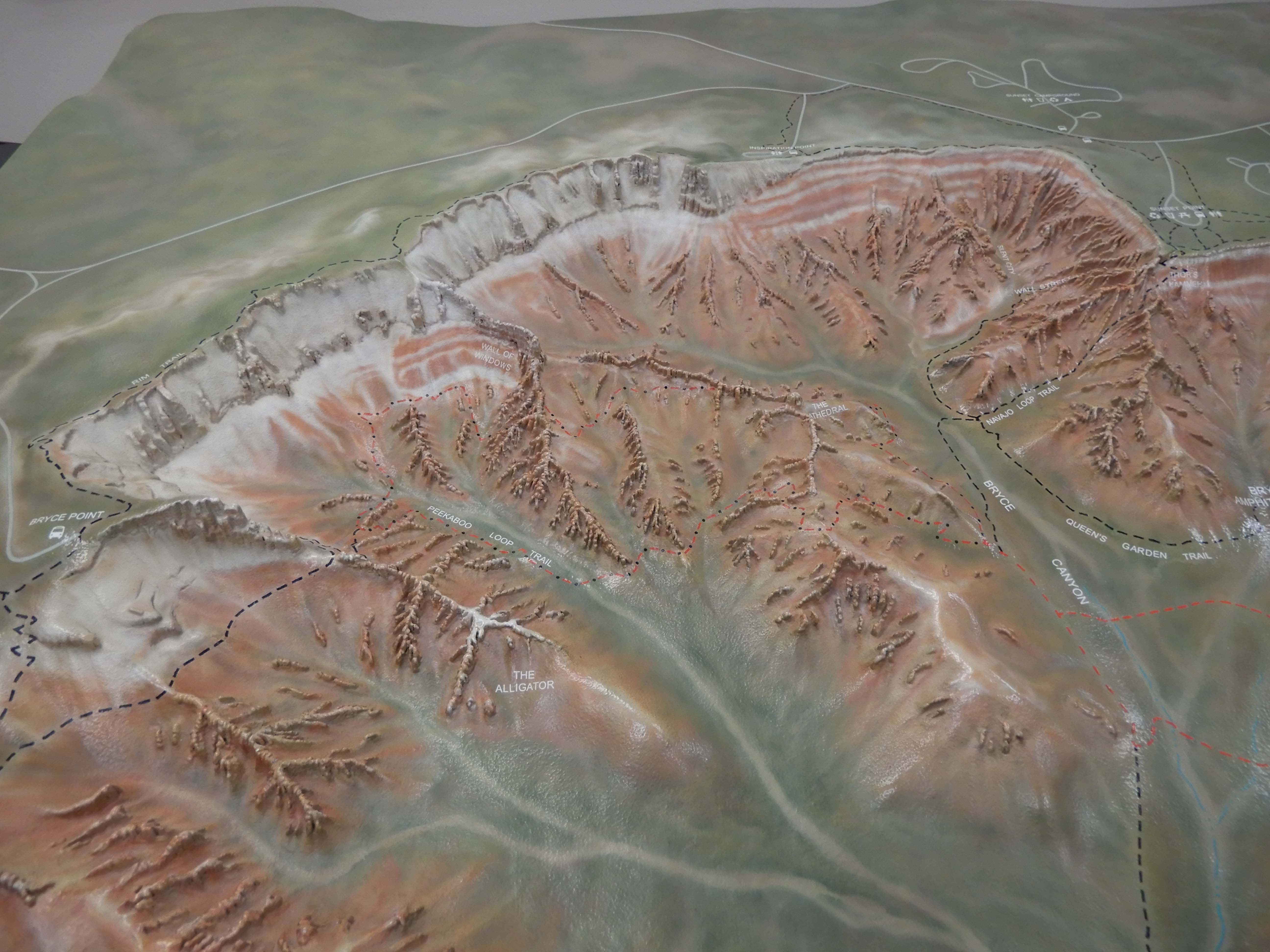 In the morning, we packed out of camp, and did our typical unfortunate thing of visiting the Visitor Center on our way out of the park. Eric photographed the topographical map of the park. See the amphitheater shape.