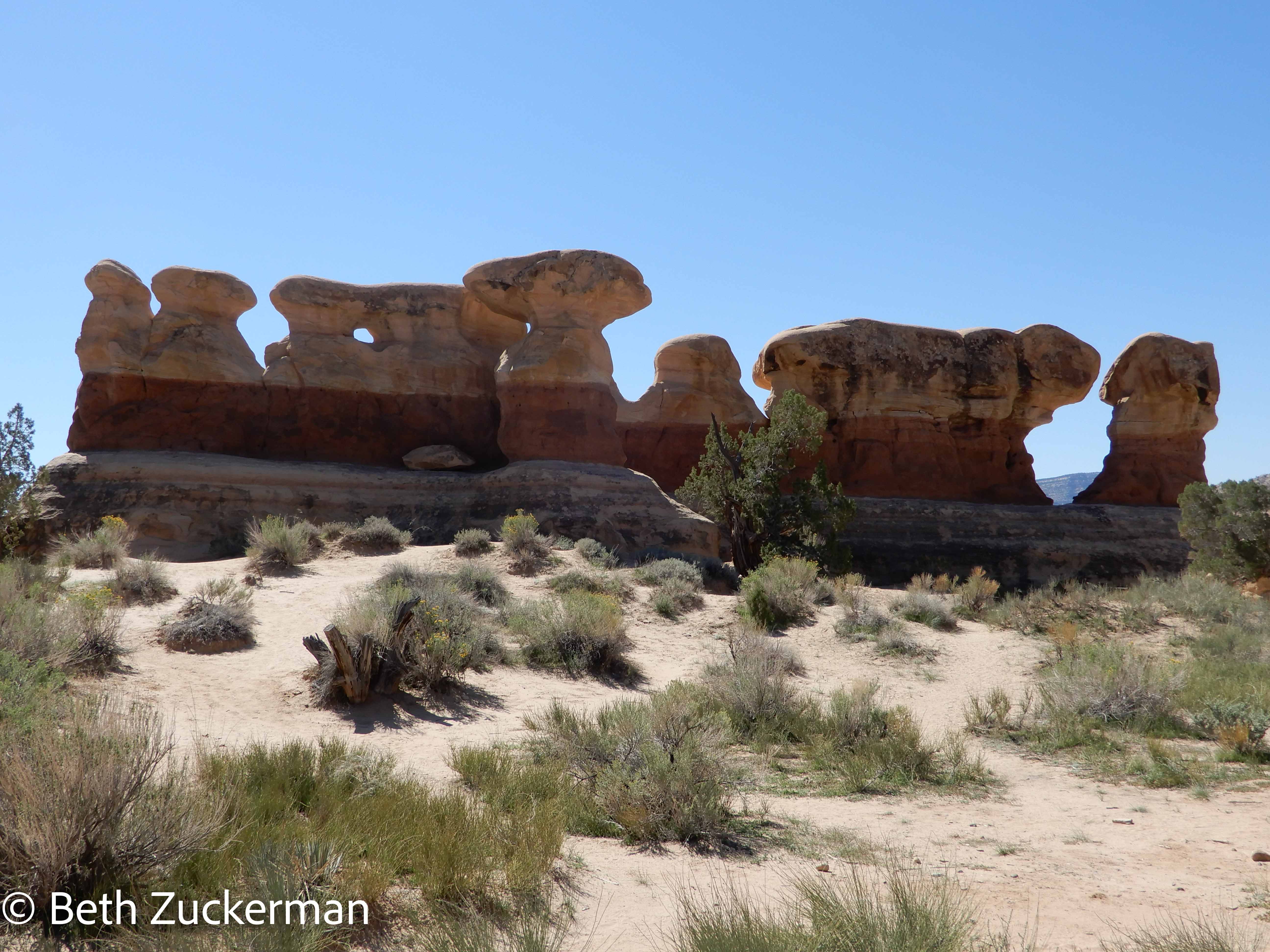 Impressive hoodoos photographed by Eric from the parking lot. I believe the top layer is Entrada Sandstone, the darker layer Dewey Bridge/Carmel Formation siltstone, and the bottom layer Navajo Sandstone, but I am guessing based on the diagram in the book for Arches National Park.