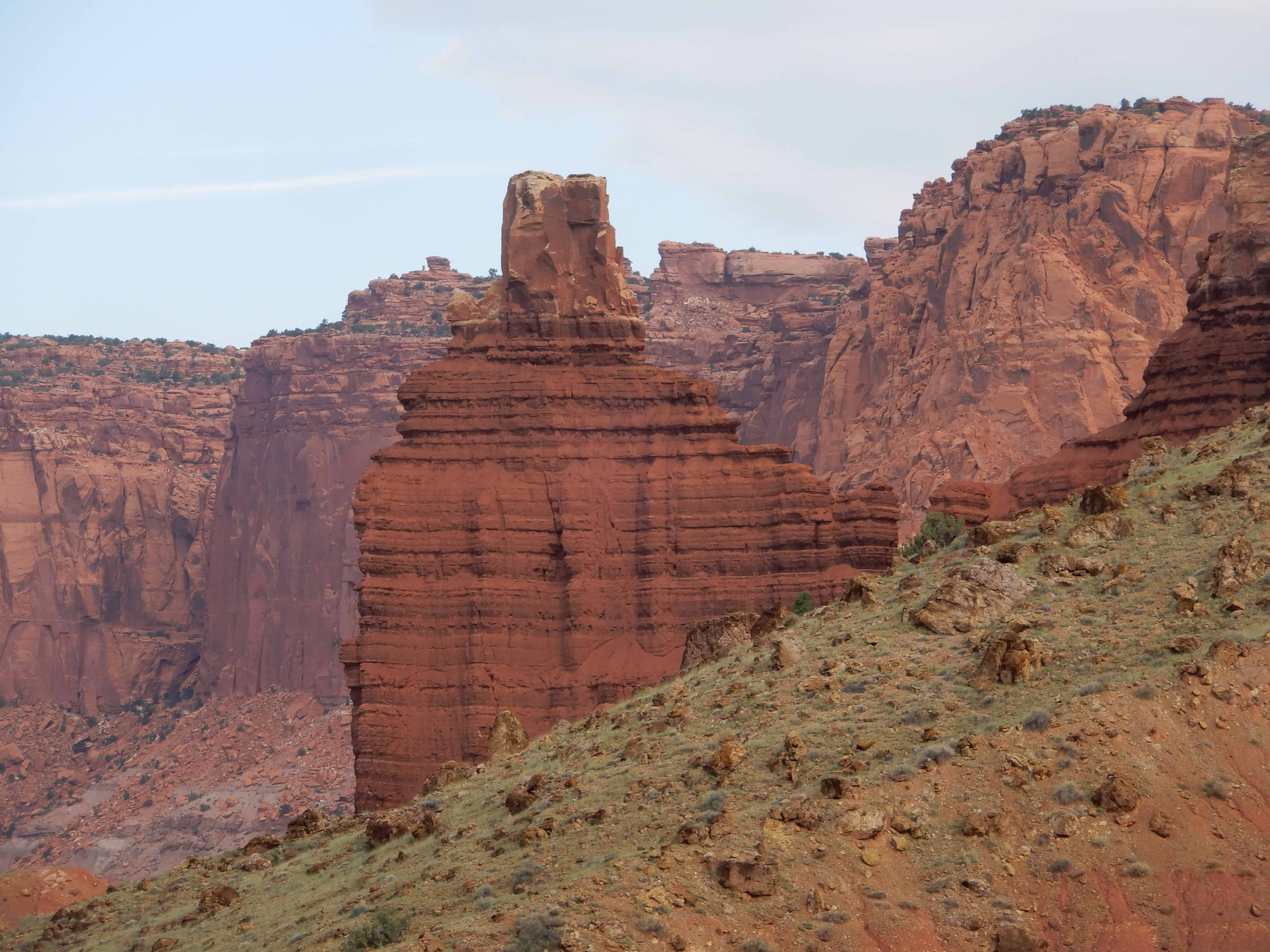 We had entertained thoughts of driving through Cathedral Valley, but a volunteer at Goosenecks Overlook said that most of the road was now wet and impassable, even with such a Subaru as Mather. We could take a good road north to a point just outside the valley from which we could see some of the features, but it would be a considerable distance around. We decided to stick with our original plan of seeing the central part of the park.