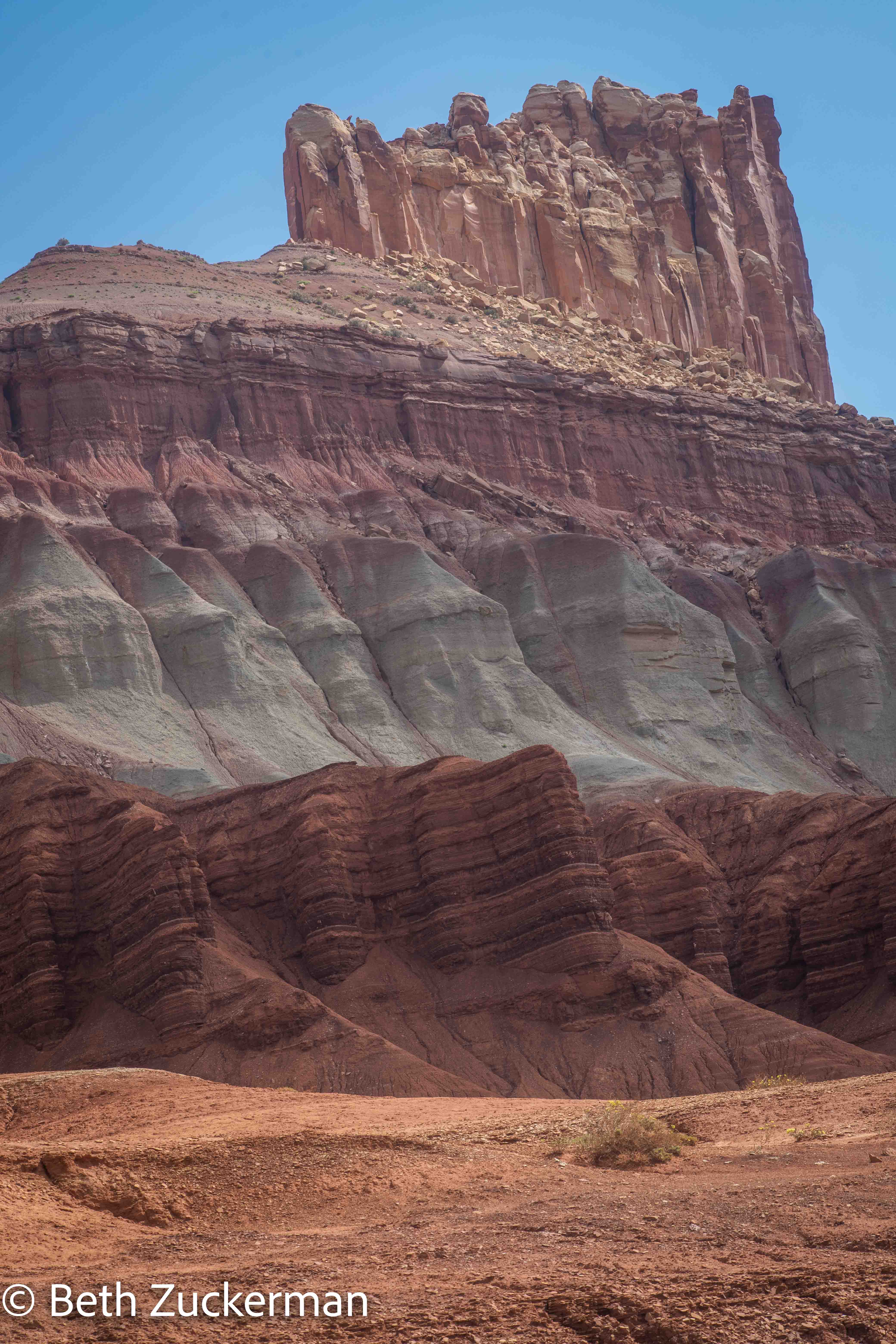 The Castle, of Wingate Sandstone, with the bluer rocks of the Chinle Formation below. [SOURCE: Geology Unfolded by Morris, Ritter, & Laycock]