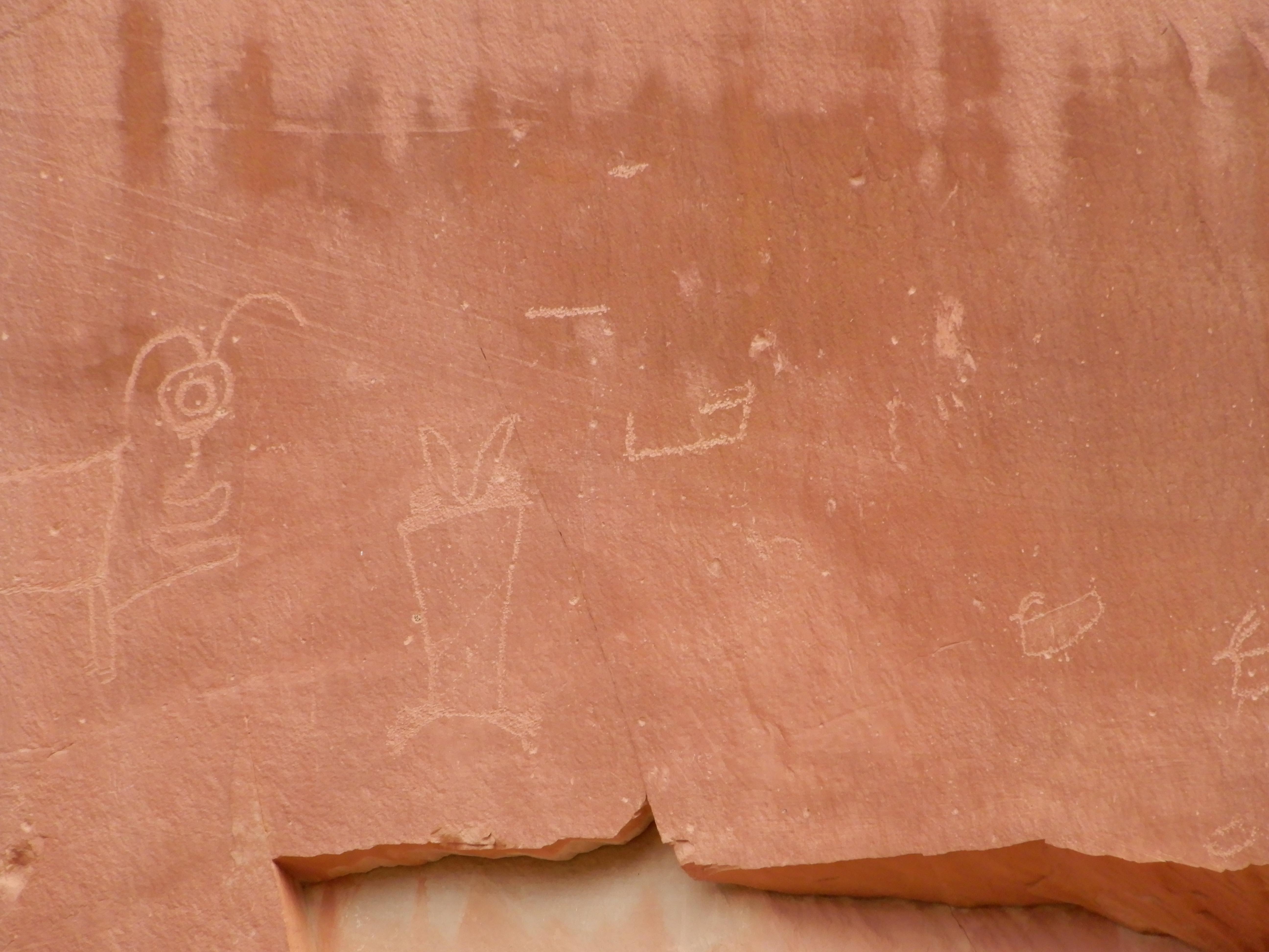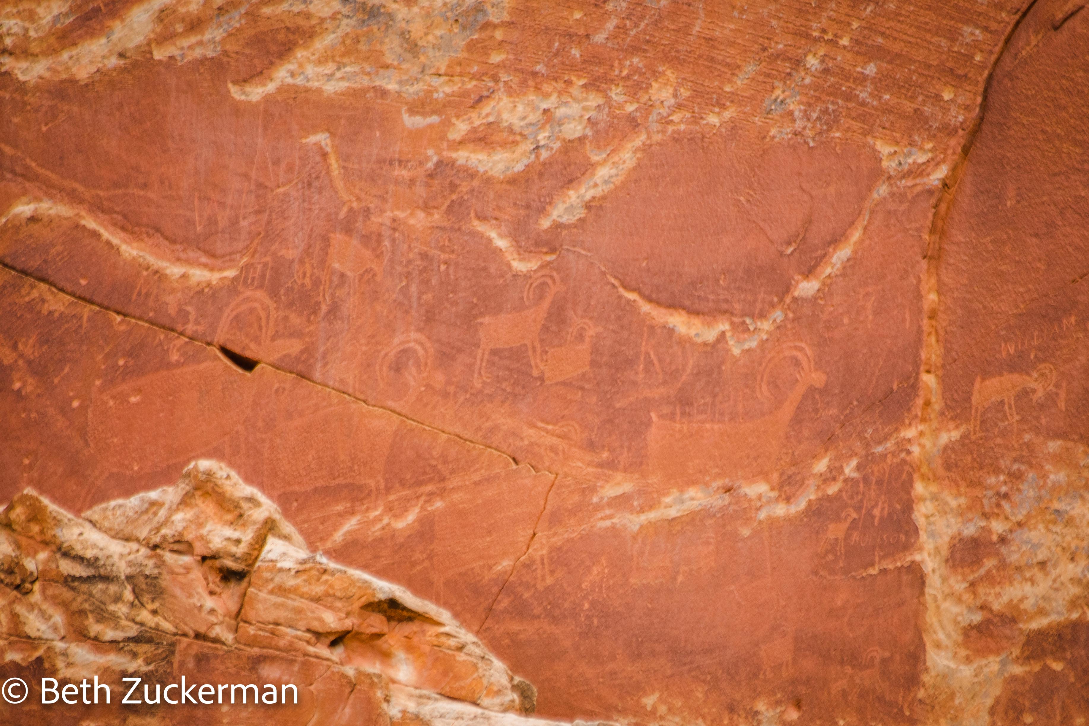 High up on the rock walls, pictograms of the people we call Fremont, such as these depicting horned animals, are easy to see from UT 24 in the park.