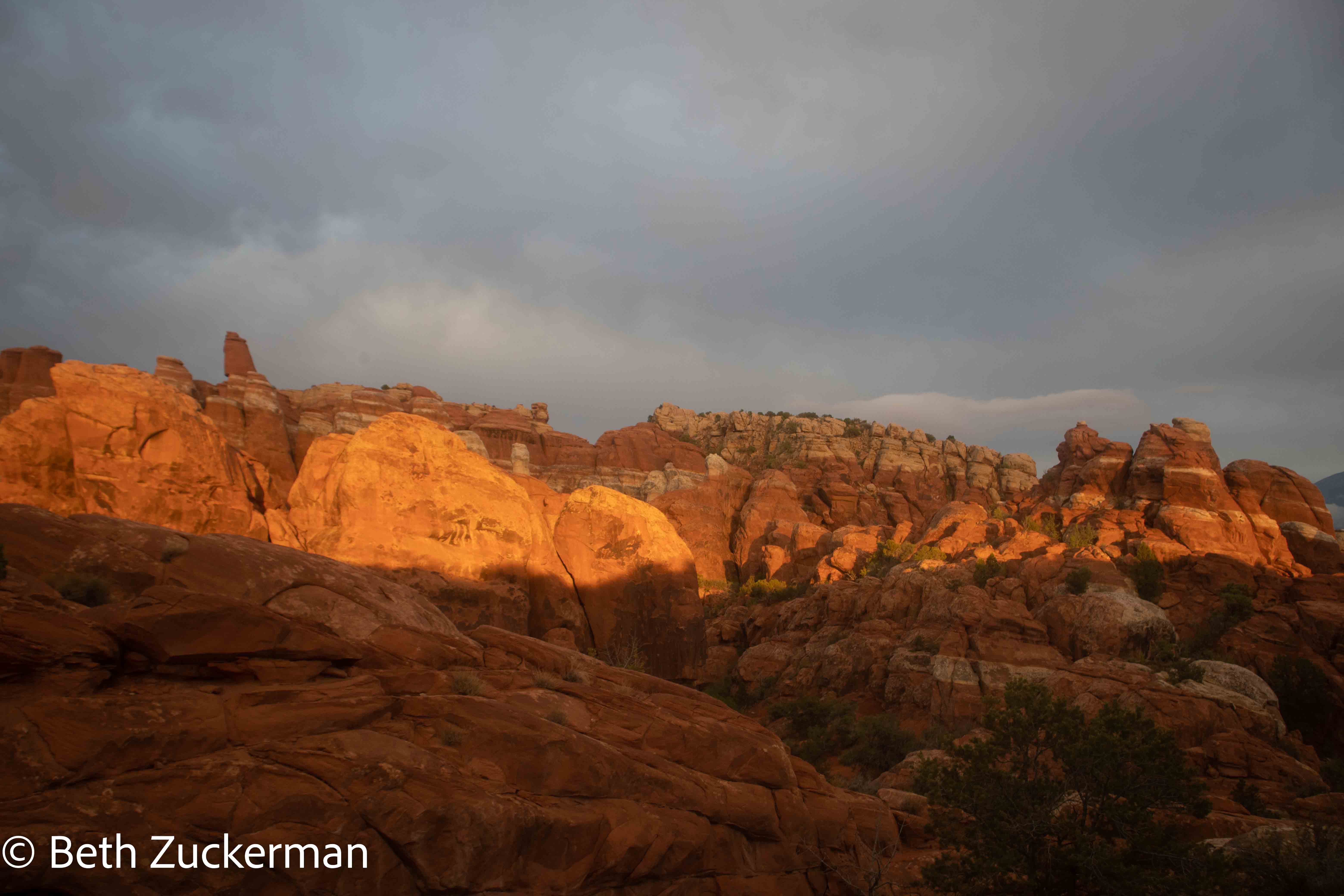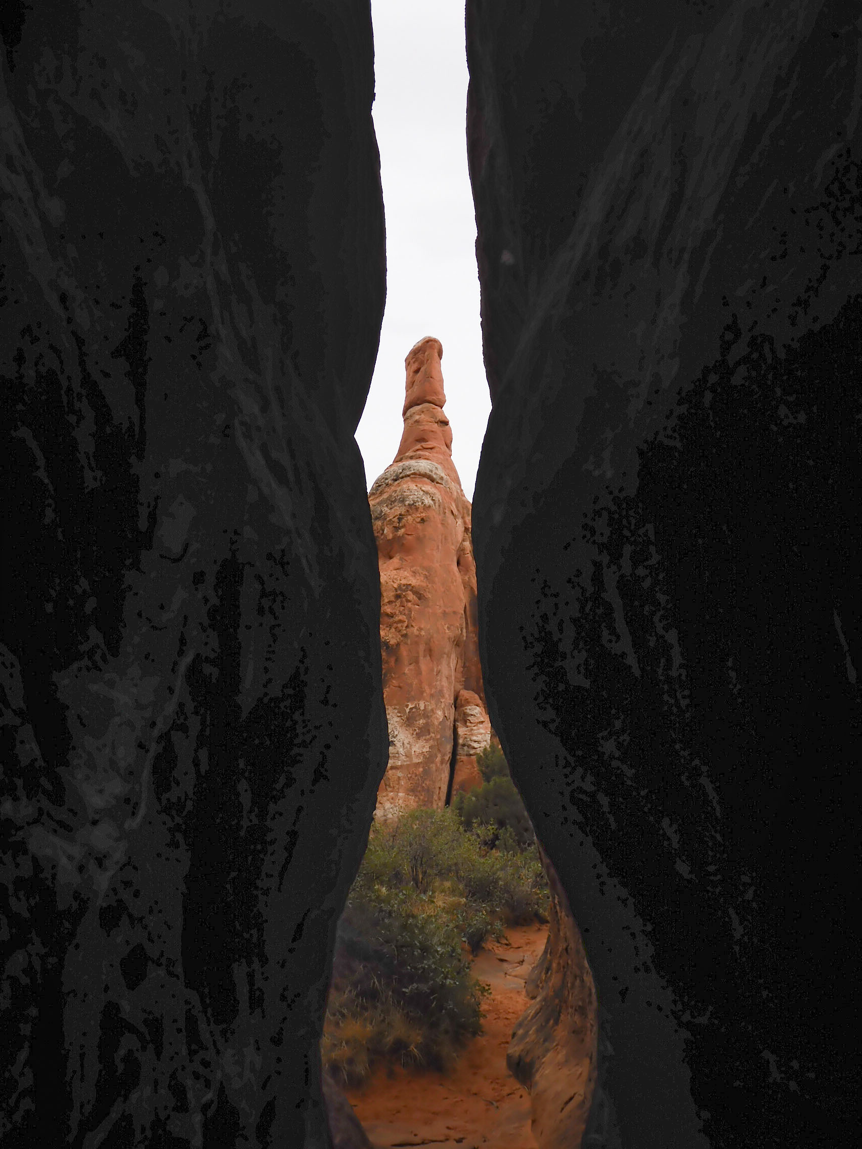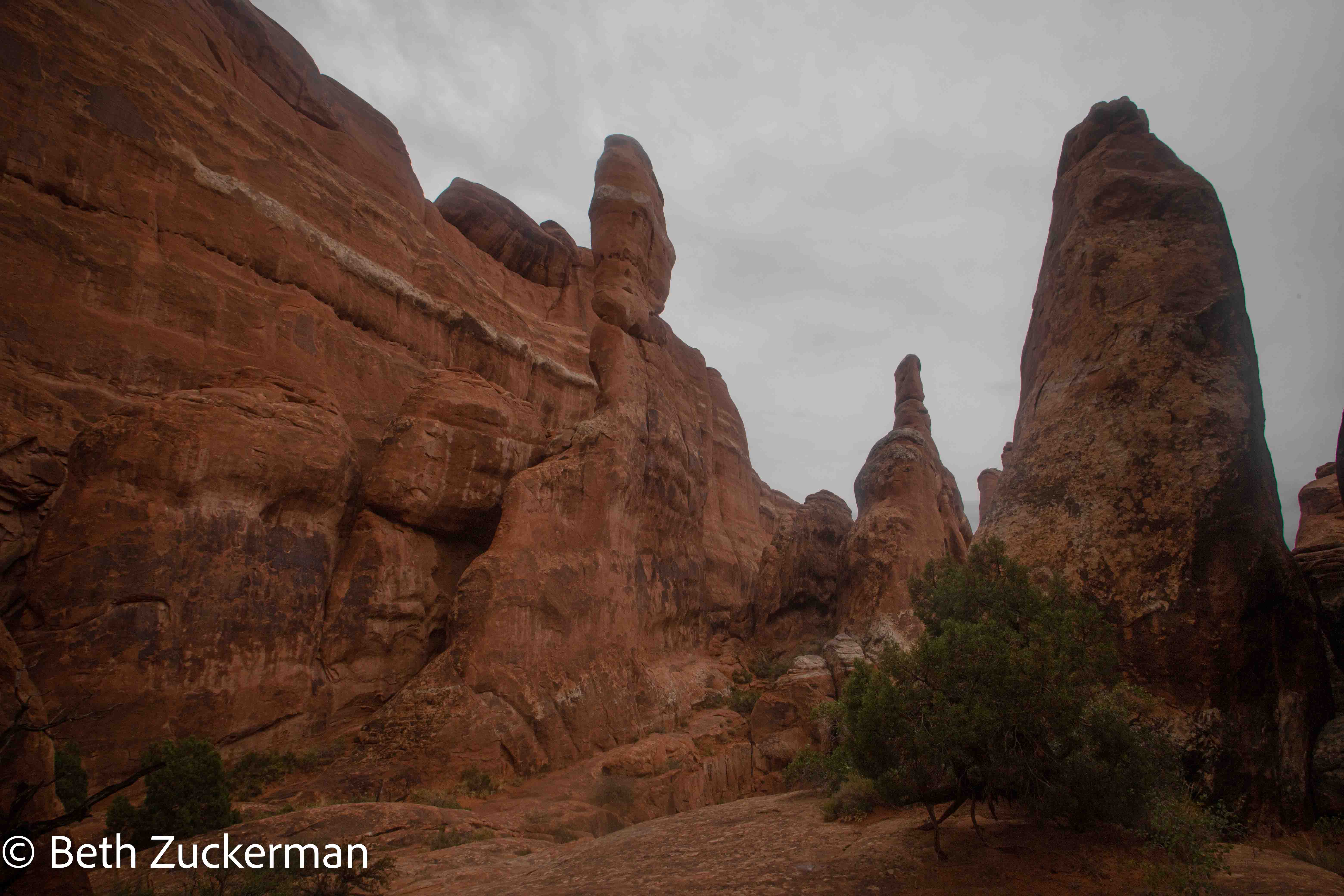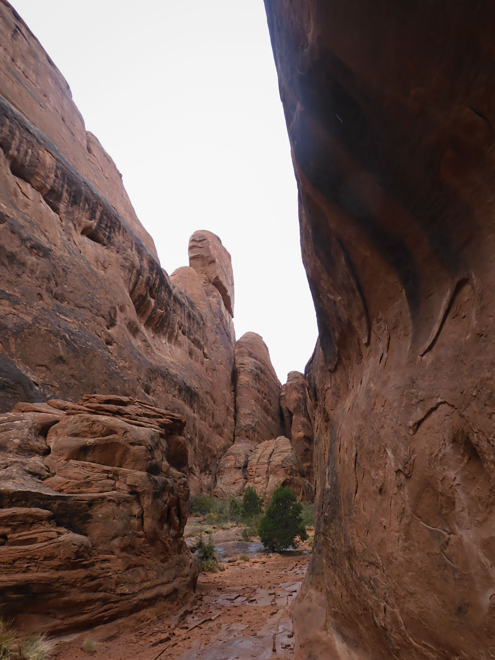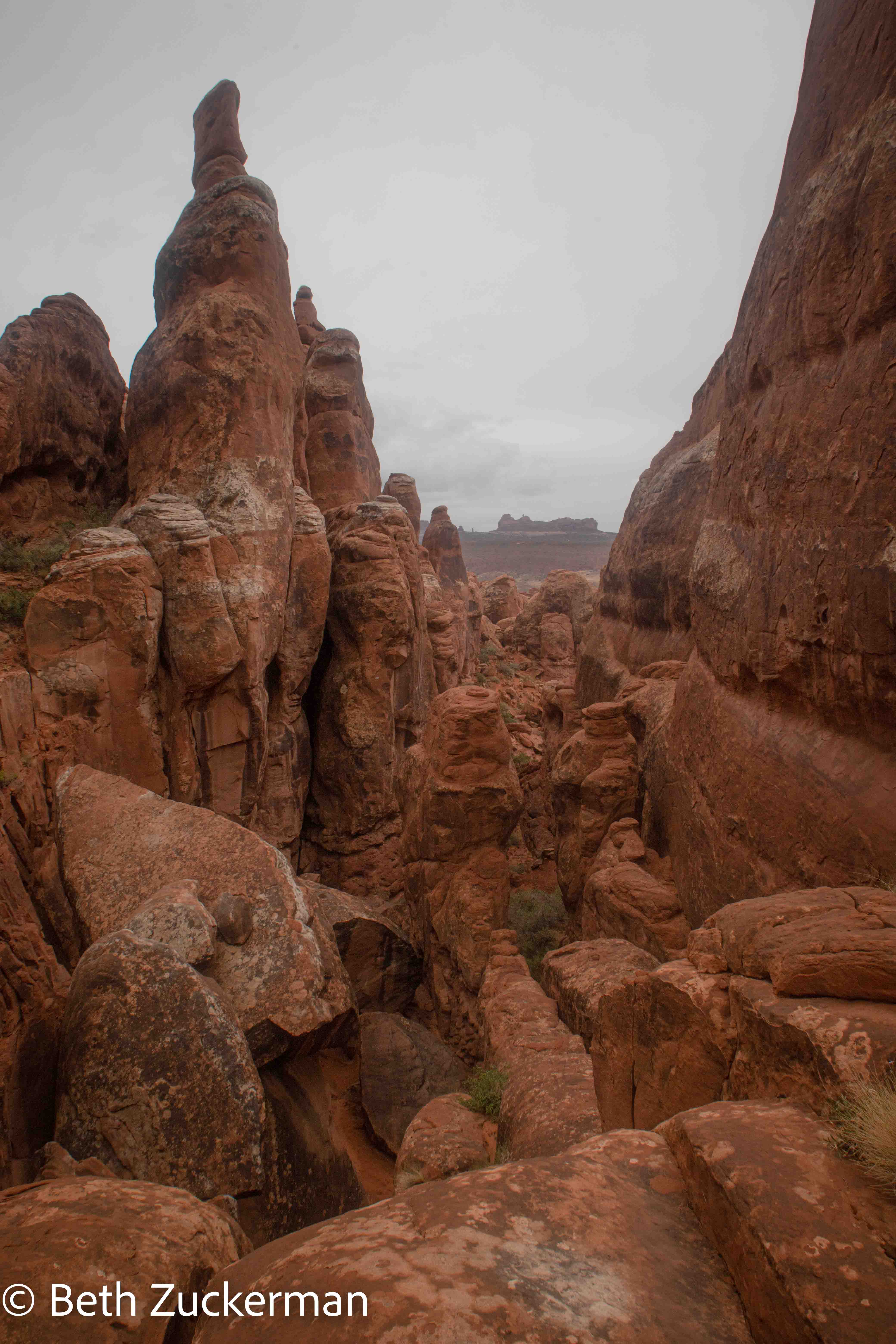 In more scrambling online with recreation.gov before the trip, we had managed to secure permits for a self-guided tour of the Fiery Furnace. This meant that we were committed to the Fiery Furnace for Wednesday; we could not wait for better weather, a day on which we might see the sunlit glow for which the Fiery Furnace is named. While the thunderstorms that Susie had predicted failed to materialize, the day was damp and drizzly. The experience of moving all of our carefully arranged gear around (and then, of course, having to rearrange it in the morning in order to be able to operate the vehicle) had left me so demoralized that I was unable to get up before 7:00. We found a package of ground turkey ominously swollen, and disappointedly discarded it. We had leftover fajitas for breakfast, and eventually were ready to approach the Fiery Furnace.