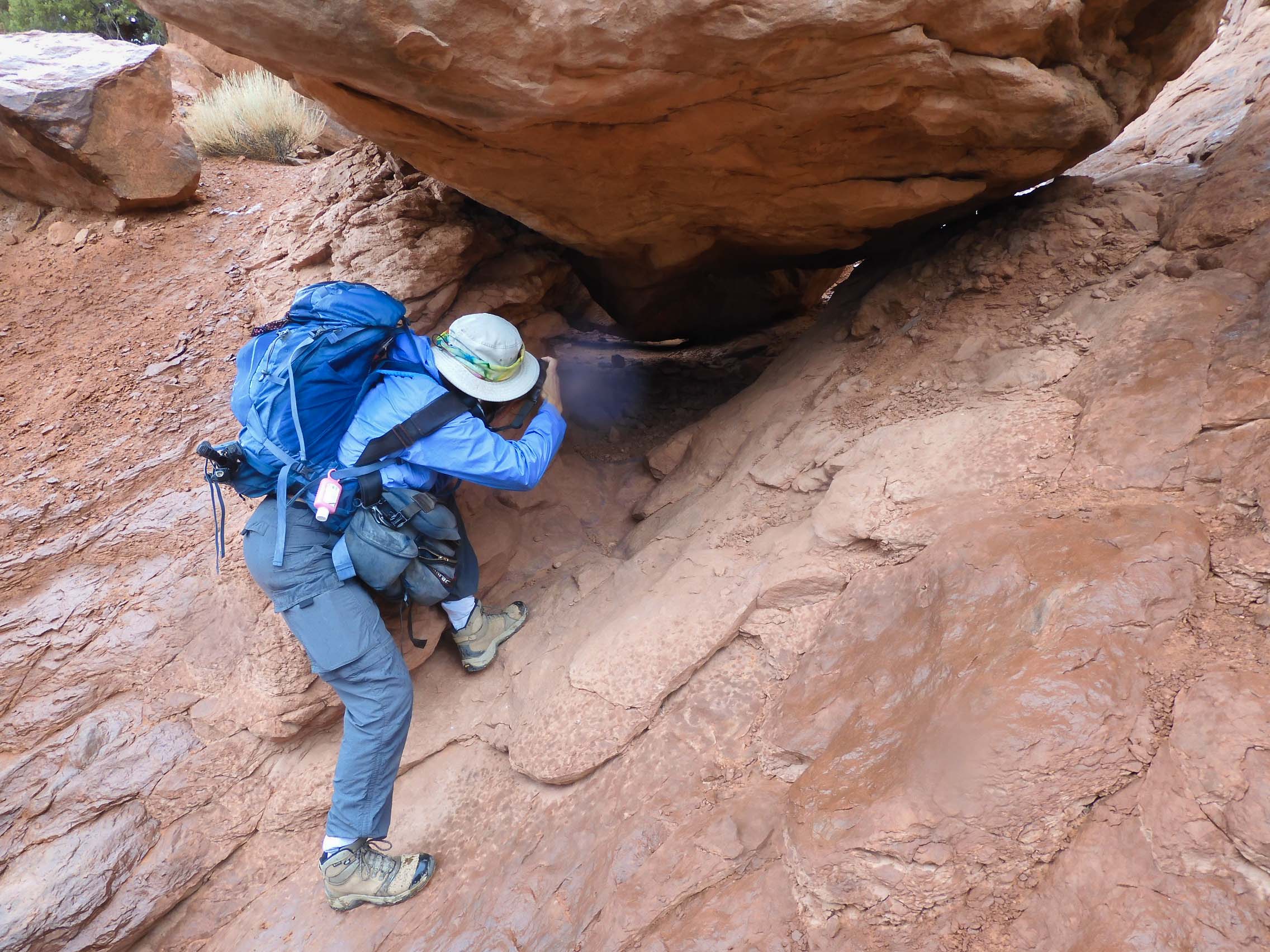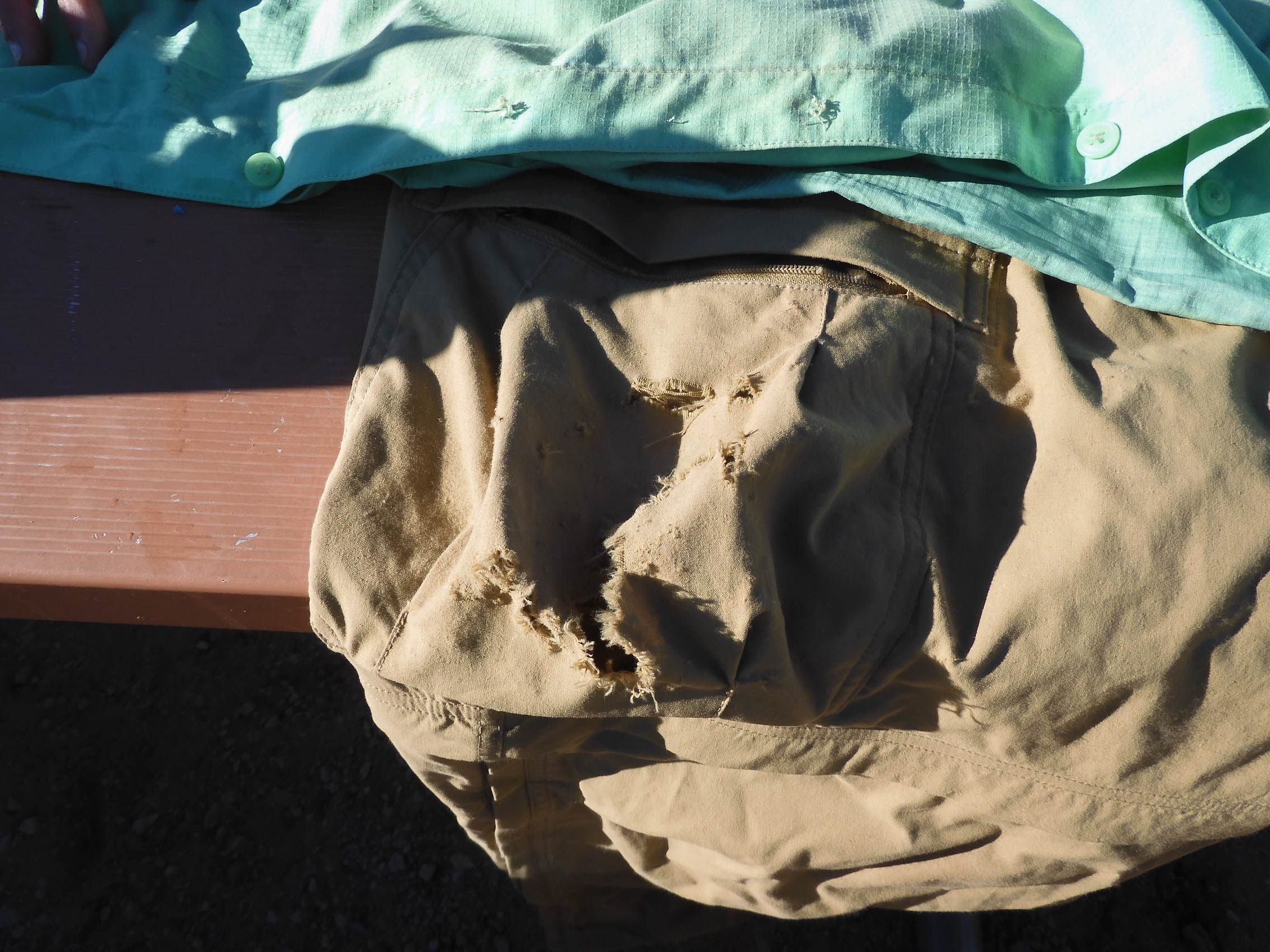 While we escaped the Furnace alive and uninjured, Eric's pants and shirt did not survive all of the butt-scrambling of the Furnace. His pocket camera, inadequately protected by this particular cargo pocket, took a particular beating -- it needed careful TLC for all usage over the remainder of the trip. Photo by Eric.