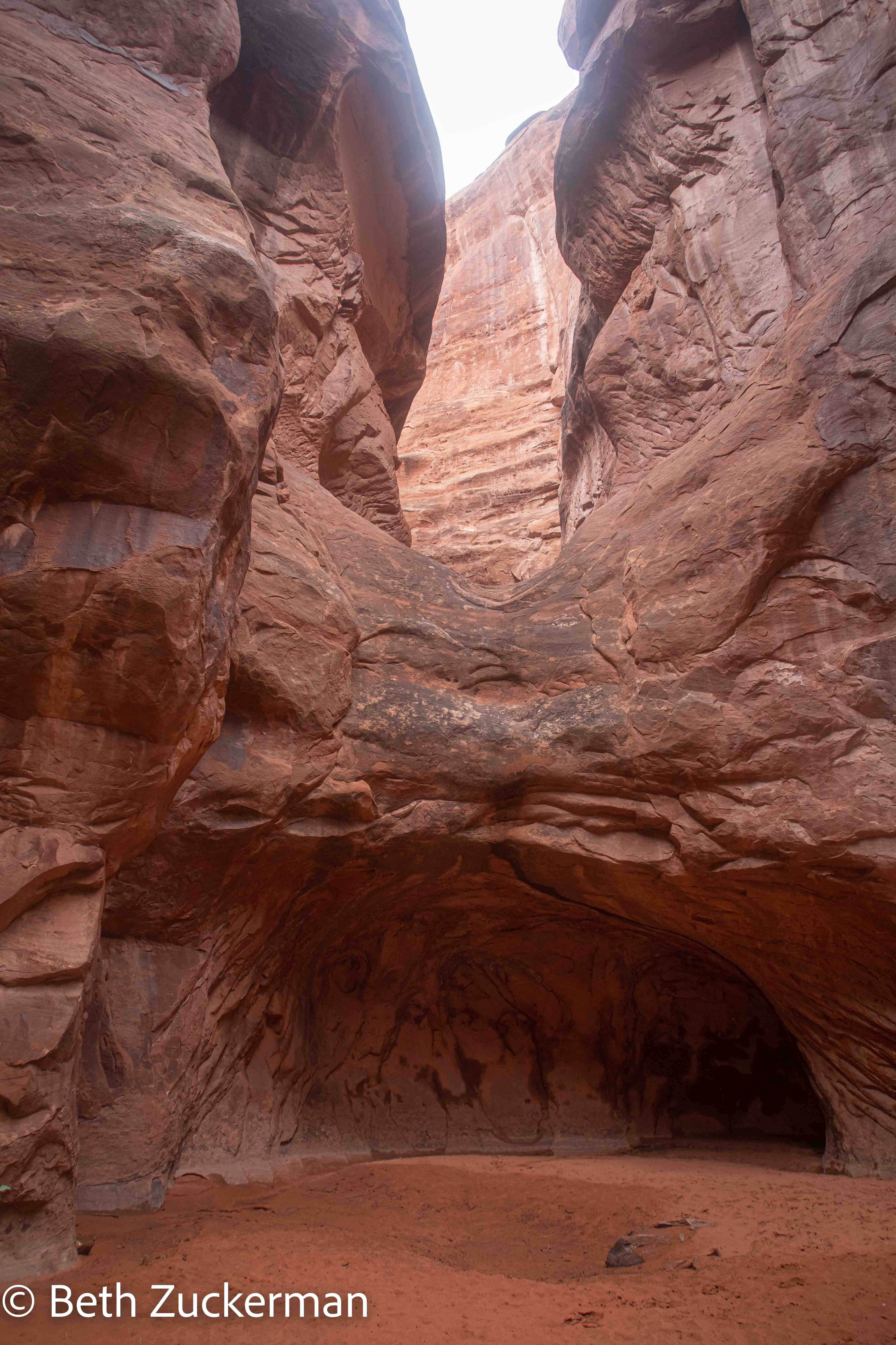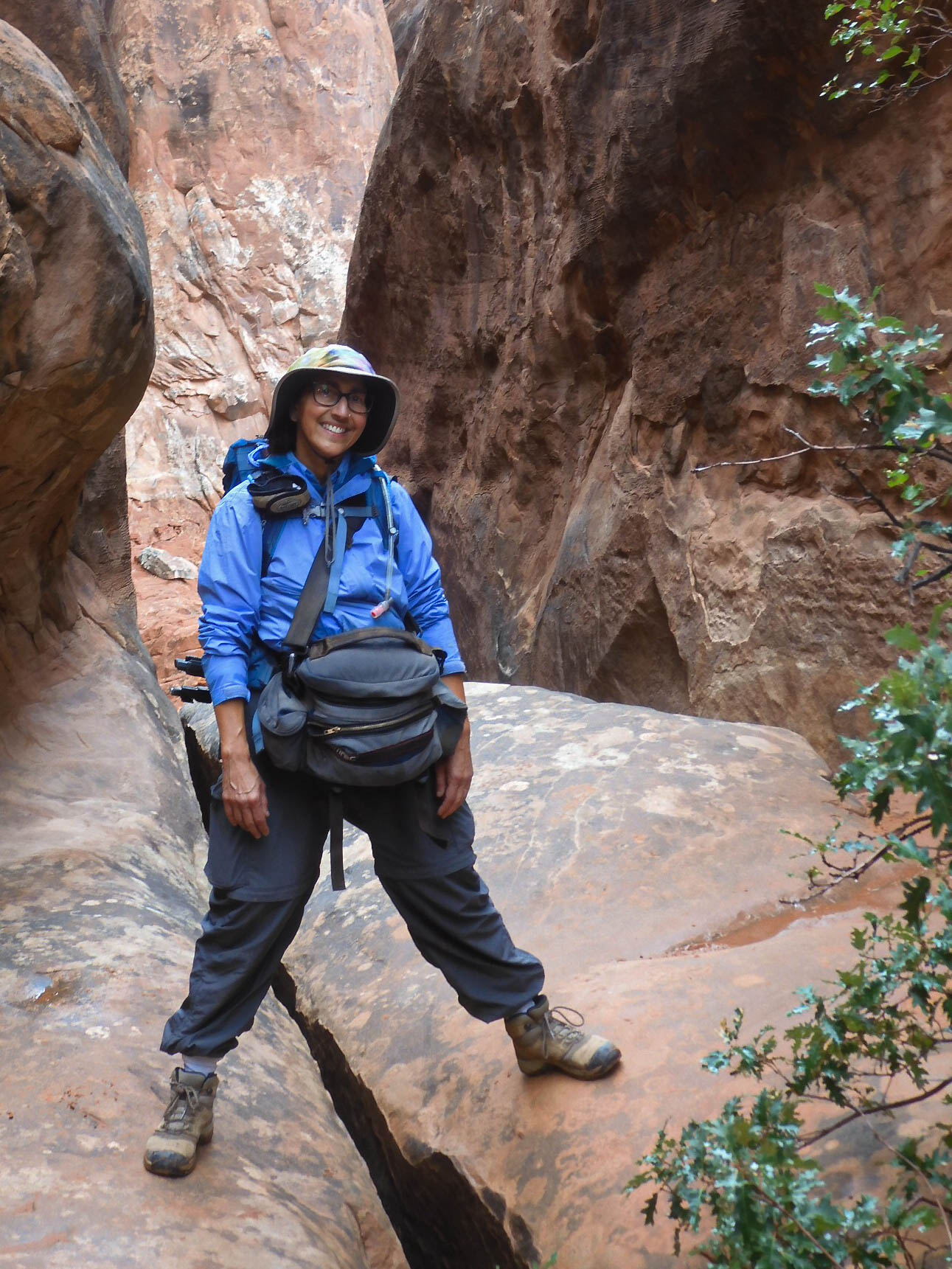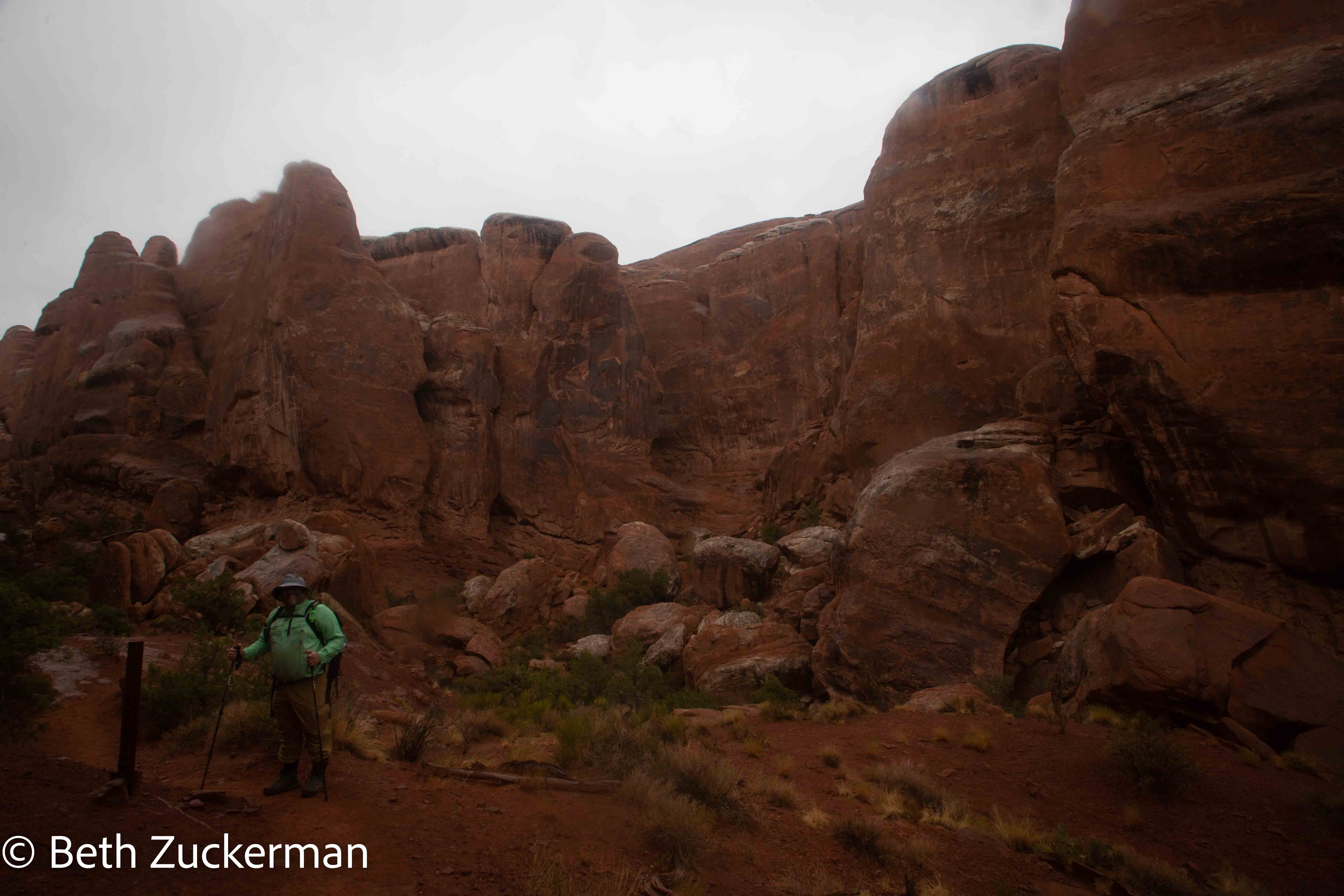On and off, we were hiking in a drizzle. The Park Service video had warned that water and fallen sand both make slickrock even slicker.
