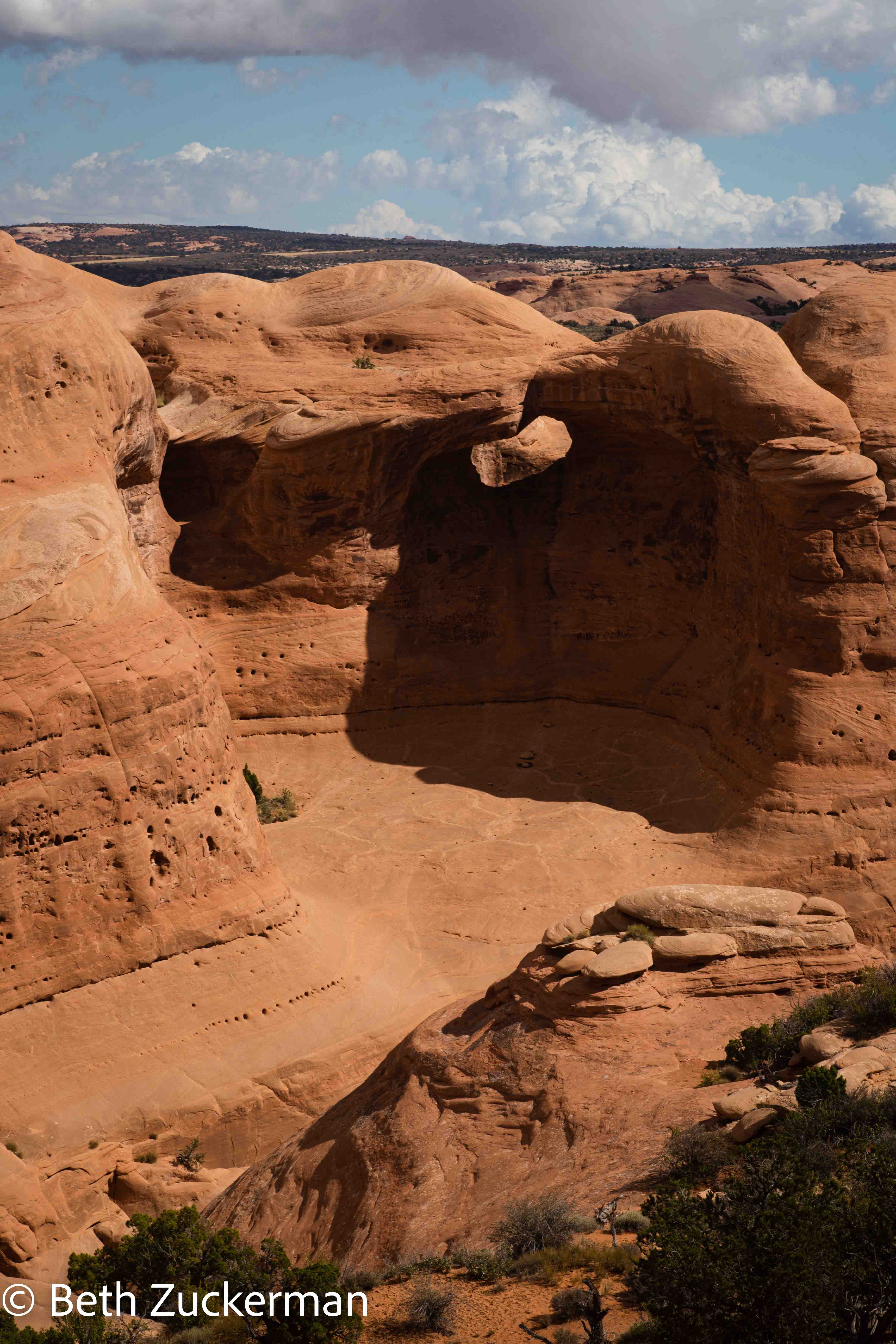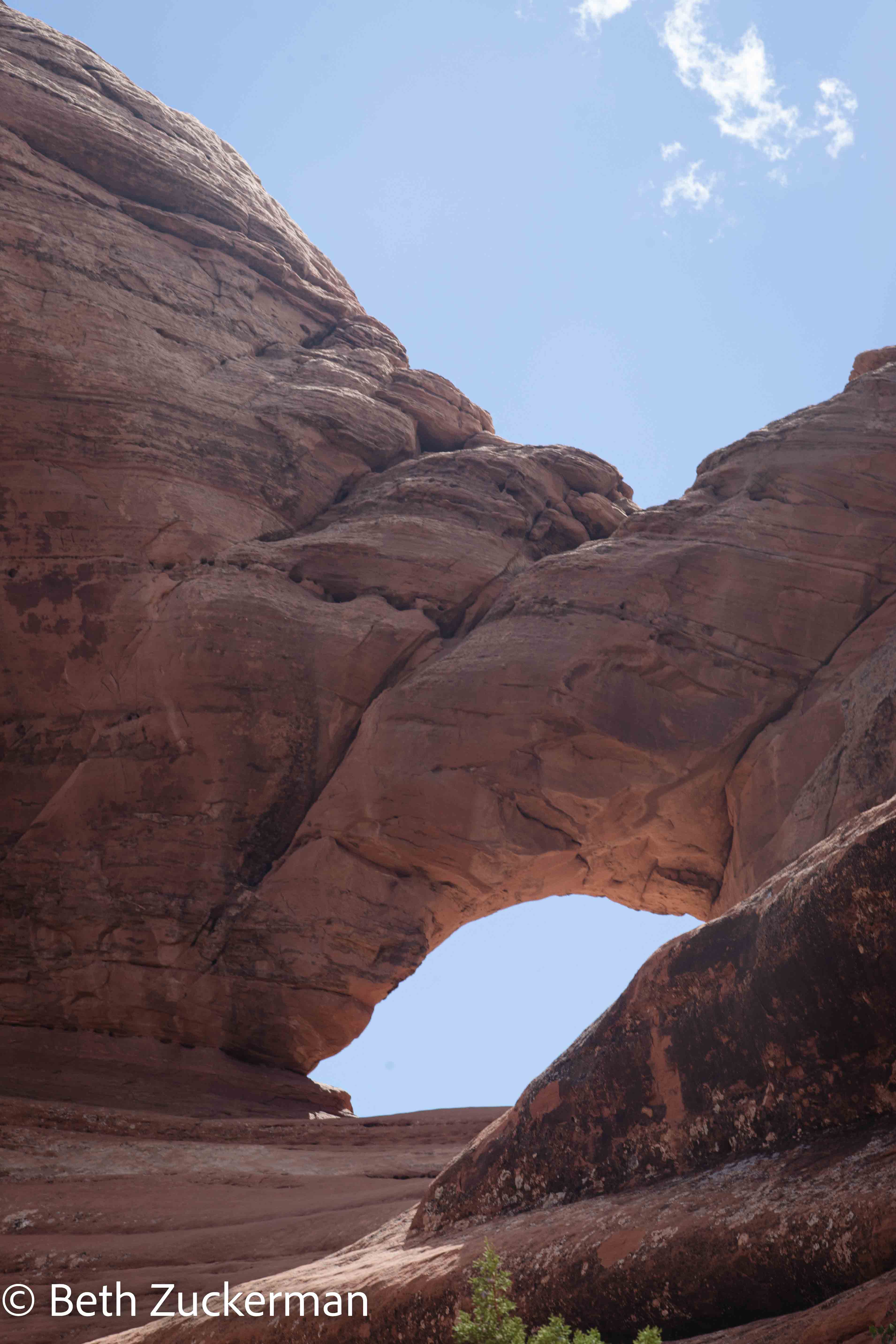 After the long climb up the slickrock, the trail turned to the left, and the geology became more interesting. In the rock wall, we could see a new arch still being formed.