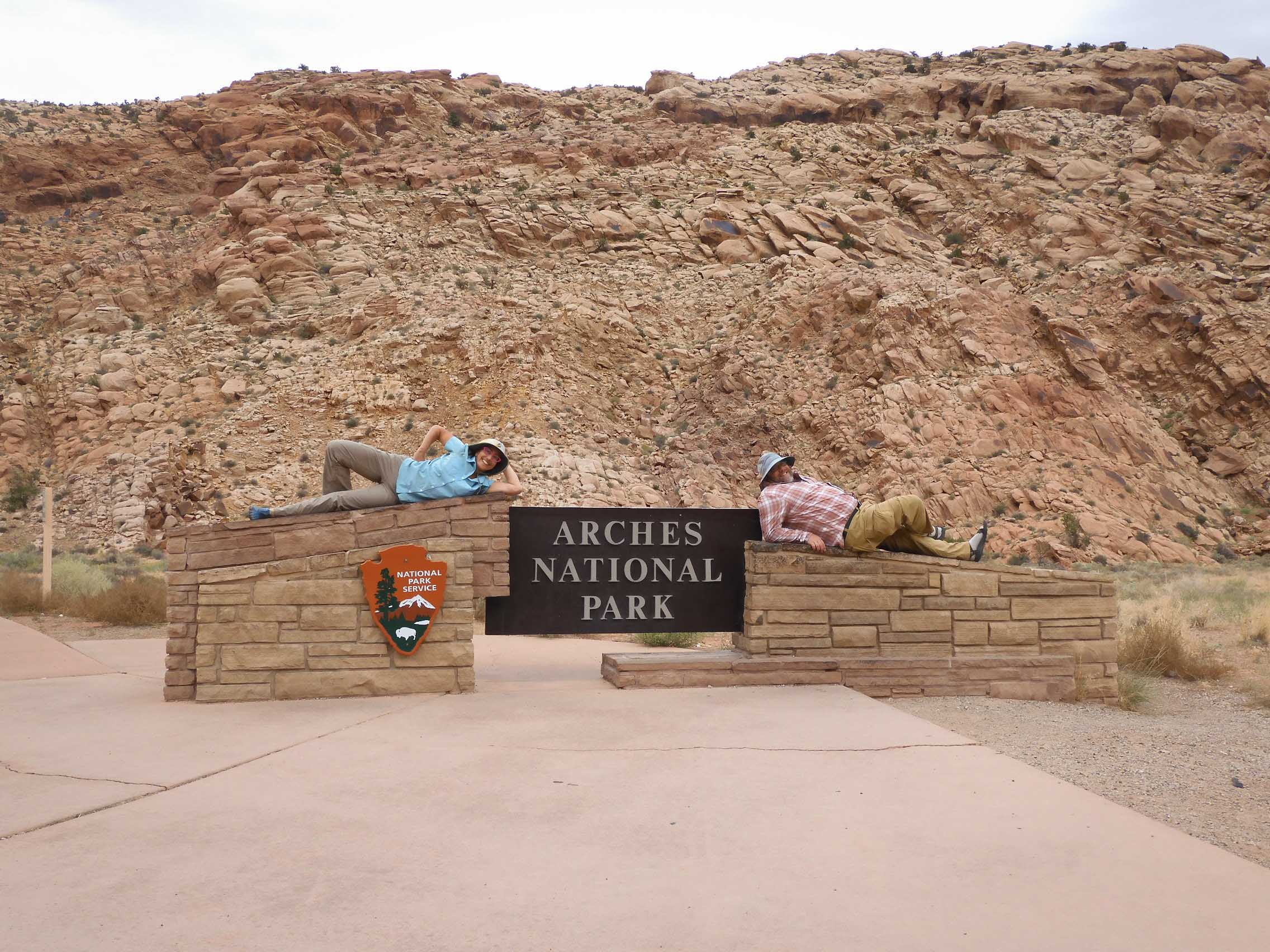 We posed at the entrance sign, using a handy NPS-provided platform. This was our 29th National Park together. Photo by Eric.