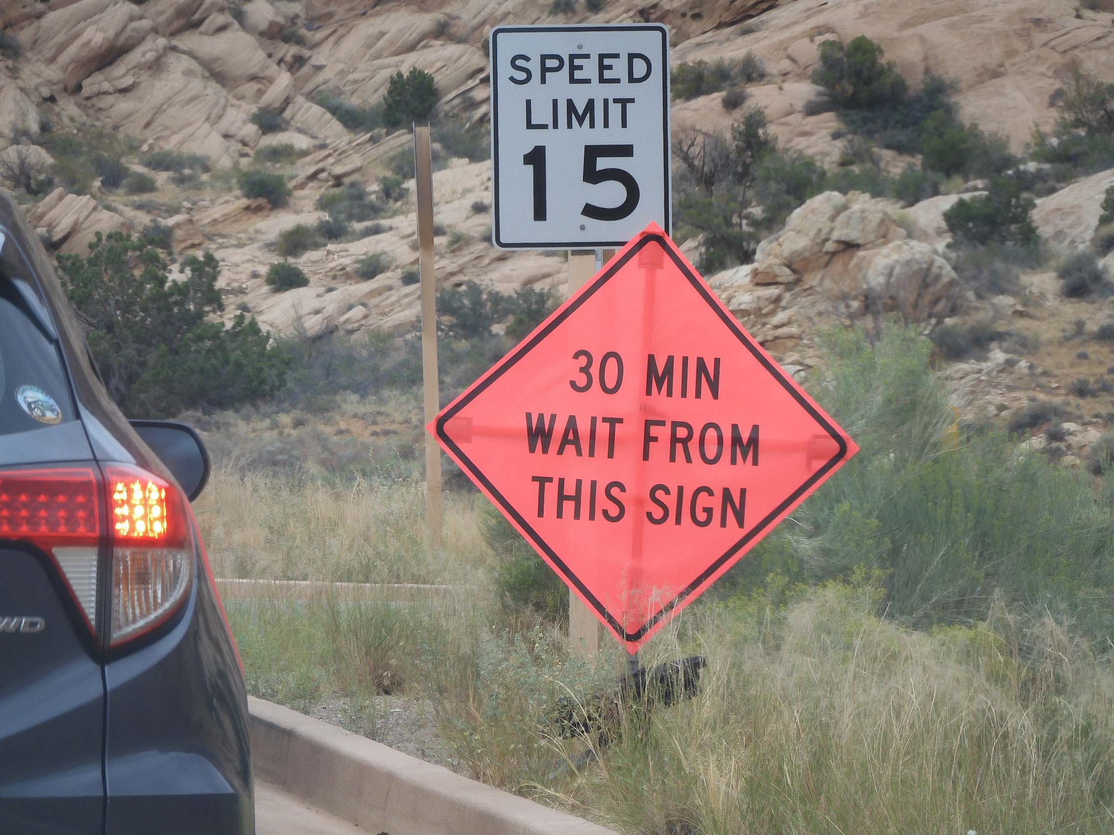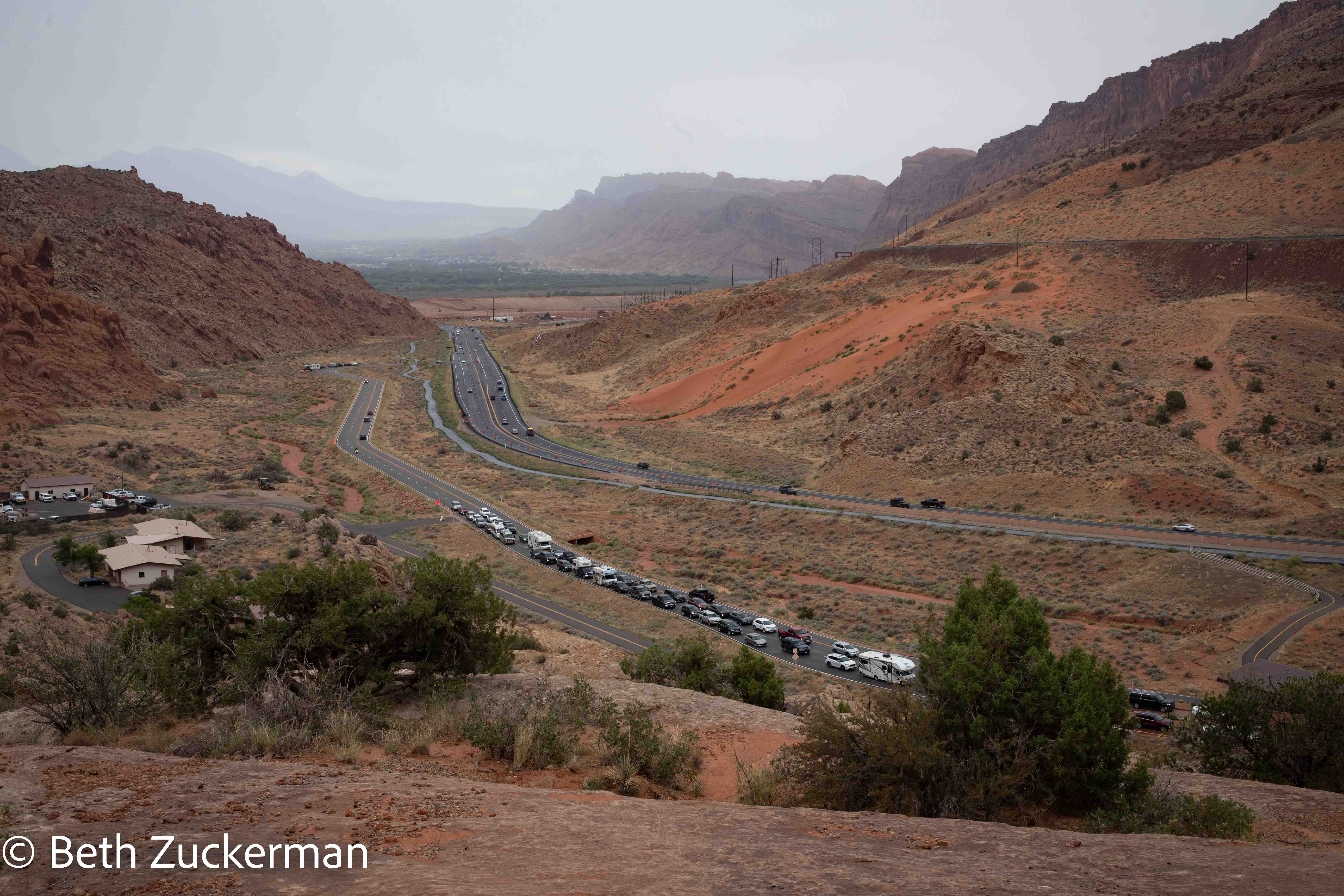 Looking back through the Moab Fault at the highway and the line of cars for entry.