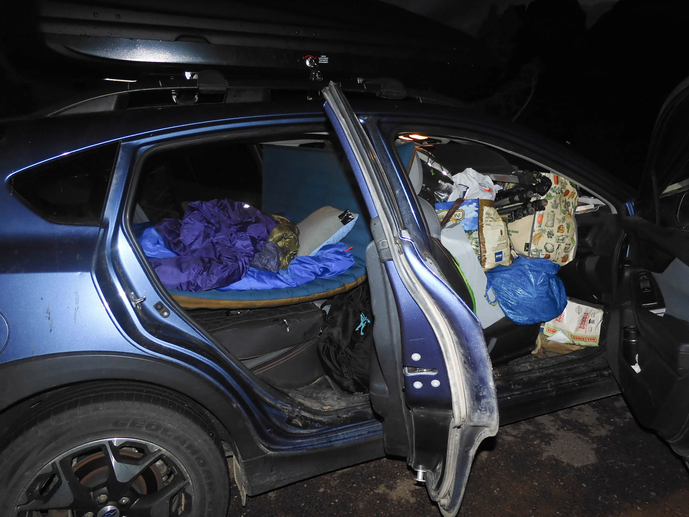 Jealous of everyone else with their RV's, I moved all of our gear around, from the back seat to the front, so that I could set up our mattress and sleeping bags in the back of Mather.