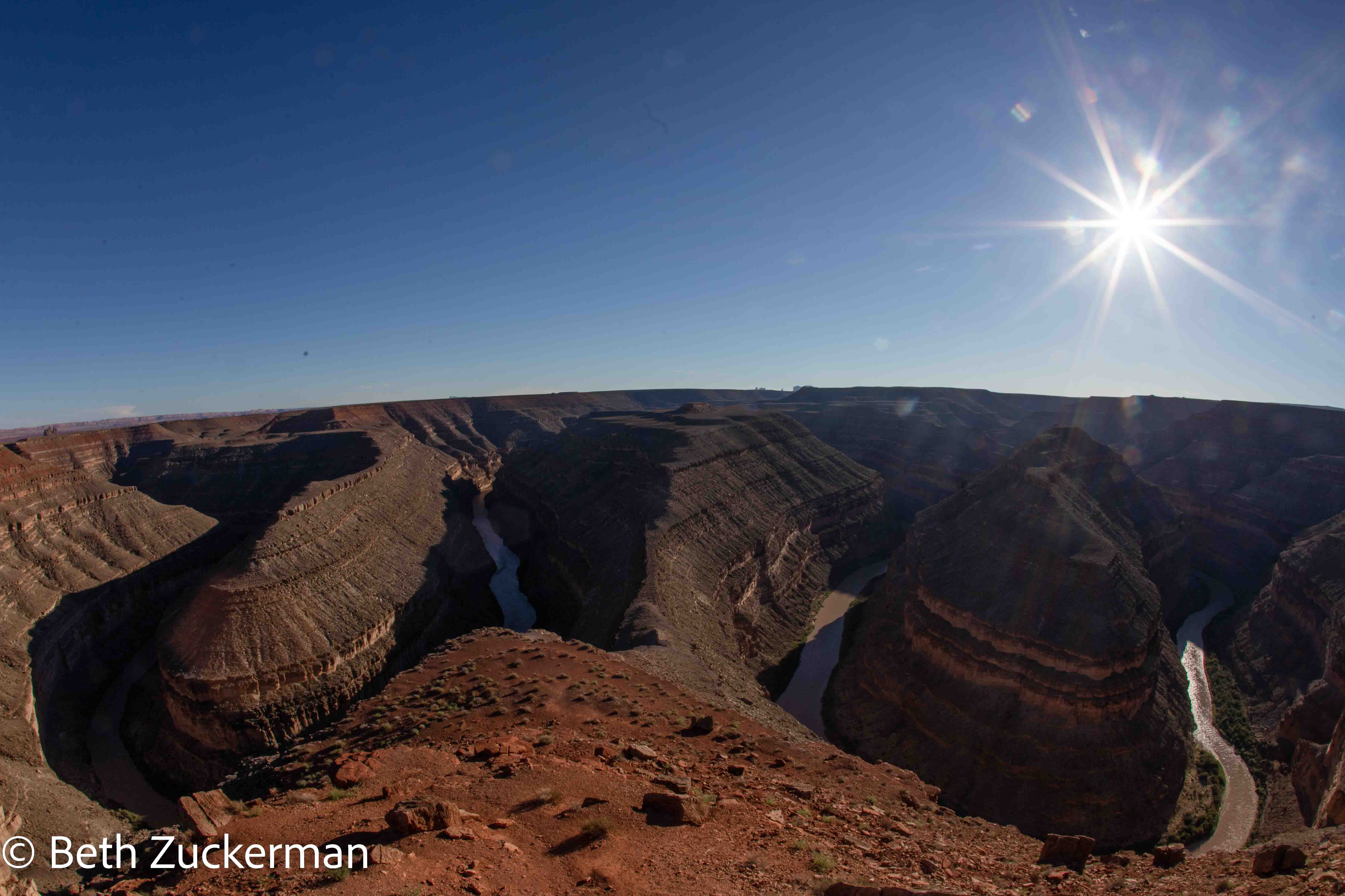 Along the way from Moab to Kayenta, we made a brief stop at Goosenecks State Park, Utah. As the Rocky Mountains uplifted, the lands below them were faulted and folded. The San Juan River always took the path of least resistance, creating the oxbow shapes we see here. Once the gorge began to develop, the rock in the middle of the oxbow rose faster as it became lighter, deepening the gorge. [Geology Underfoot in Southern Utah, Orndorff, Wider, & Futey, 2006]