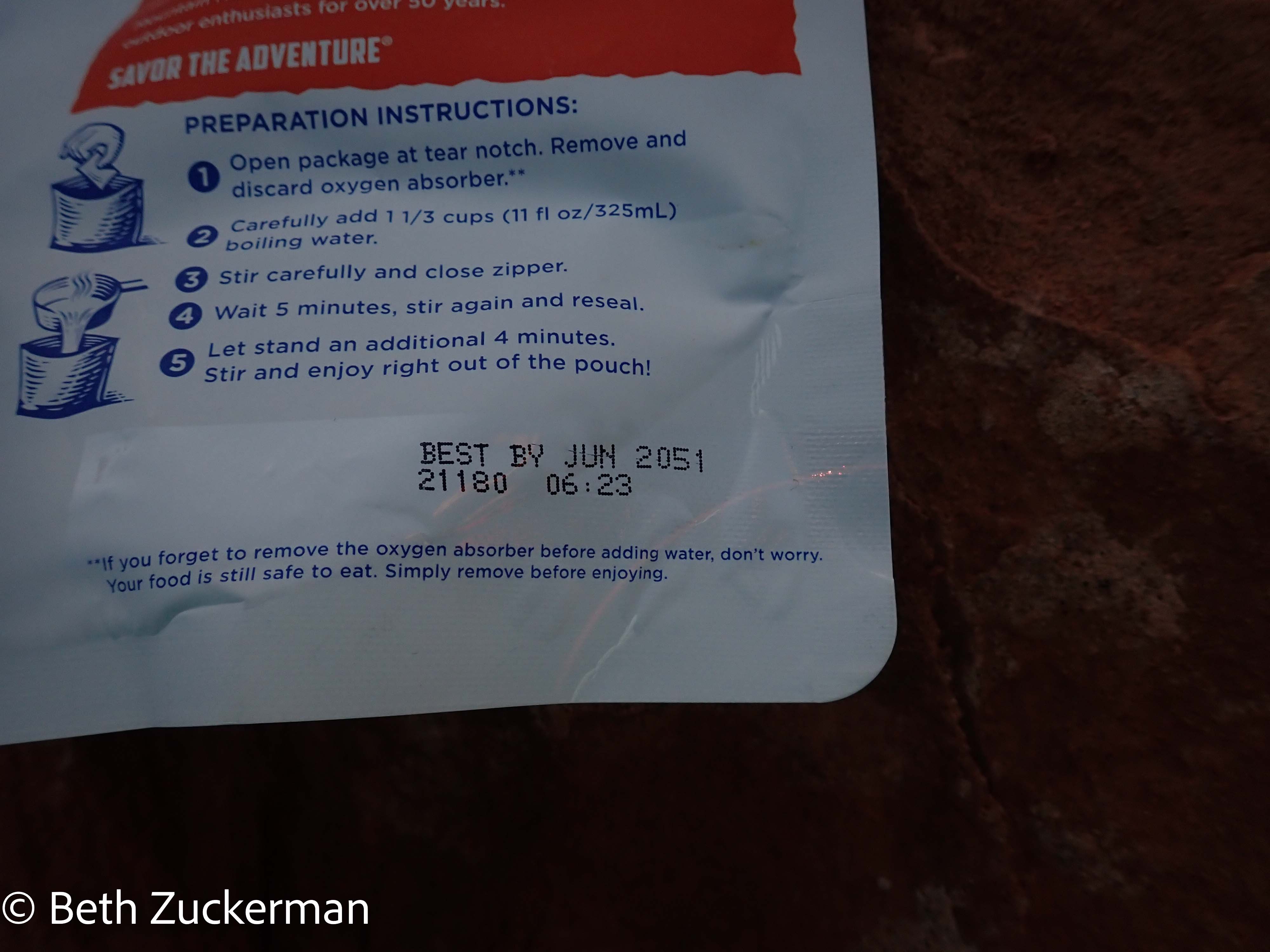 At the end of the overlook, with photographers and their tripods above us, Jon heated water for our backpacker meals on a white gas stove. I noted the expiration date on my backpacker meal.