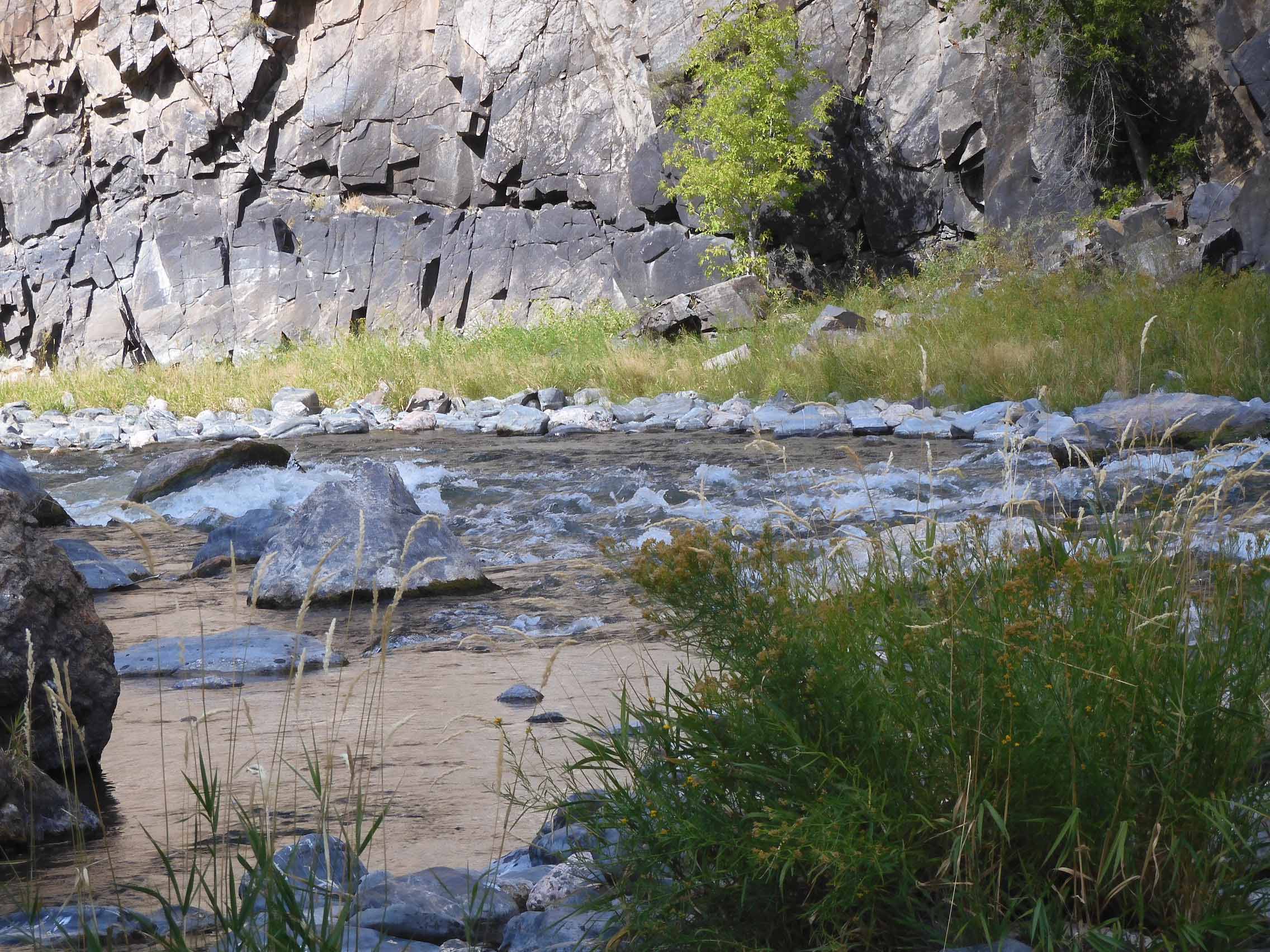 Although Ranger Sara(h) had predicted that it would take us about the same amount of time to ascend as to descend, I had planned for half again as much time to ascend as descend, so I had estimated our turn time at 14:00. We remarkably reached the bottom at 13:49, allowing us a few minutes to take in the beauty of the river. Ranger Sara(h) had warned us that the river was swift and strong and thus dangerous to enter, but we both wanted to touch and experience the water. I rinsed my face in the river, and Eric put a toe in.