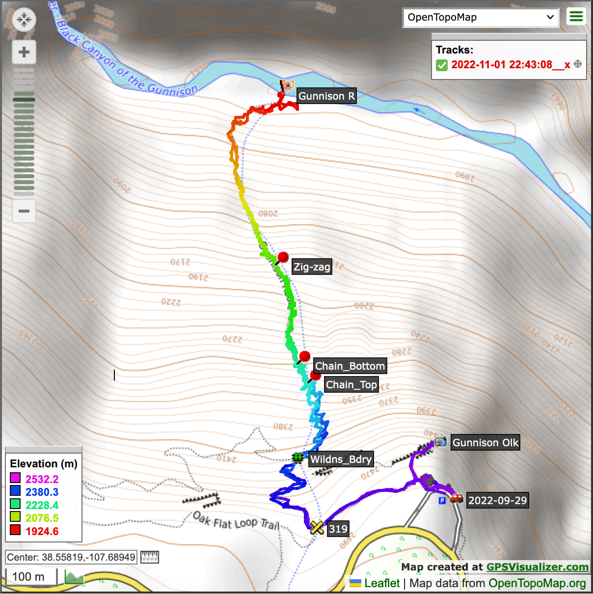 Ranger Sara(h?) came out of the Visitor Center and showed us a book with photos and route descriptions. We discussed how much water to carry (we each took six liters), how to find our way, and the use of WAG bags to carry out any solid waste. Ranger Sara(h?) recommended the Gunnison Route, which would take us down 549 meters/1,800 feet in 1.6 km/1 mi, as the "most moderate" of the available routes into the canyon. One part of the route, near the beginning, had a chain to help you descend and then ascend the steep terrain. She said most people would take 4-5 hours to complete the entire route, so I assumed we needed to plan on 10. It was a little bit after 9:00, so I thought we had just about enough daylight.