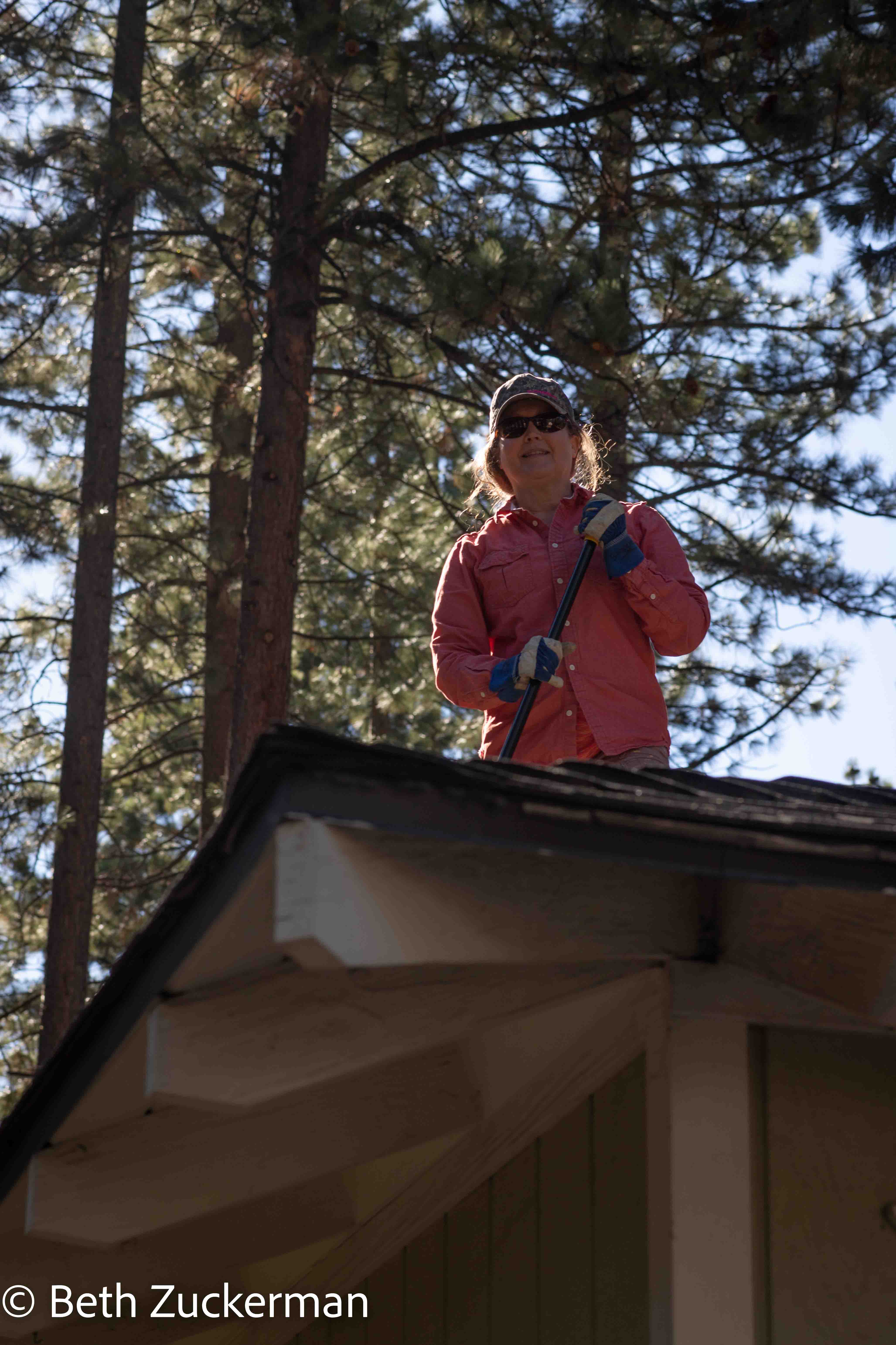Ashley was deep in fire prevention efforts, sweeping pine needles off the roof. We helped bag up pine needles and cones.