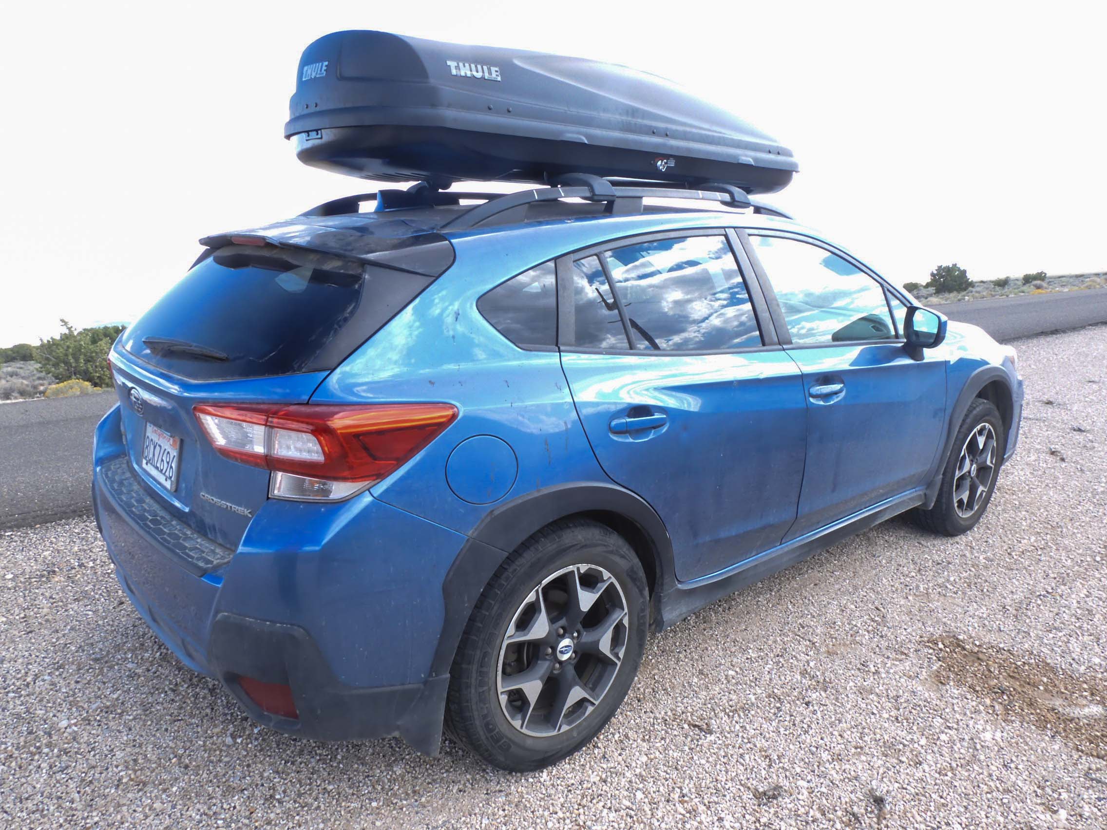 Camping means bringing a lot of gear! Cracks in the bottom surface forced us to replace the faithful Sears X-Car-Go that we purchased for our drive across the country in 1993, assembled for us by Ryland and my Dad in our back yard in Pine Hills in Albany just before we left. Mather the Subaru (see Stephen Mather) has now been outfitted with this spiffy new rooftop carrier. Photo by Eric.