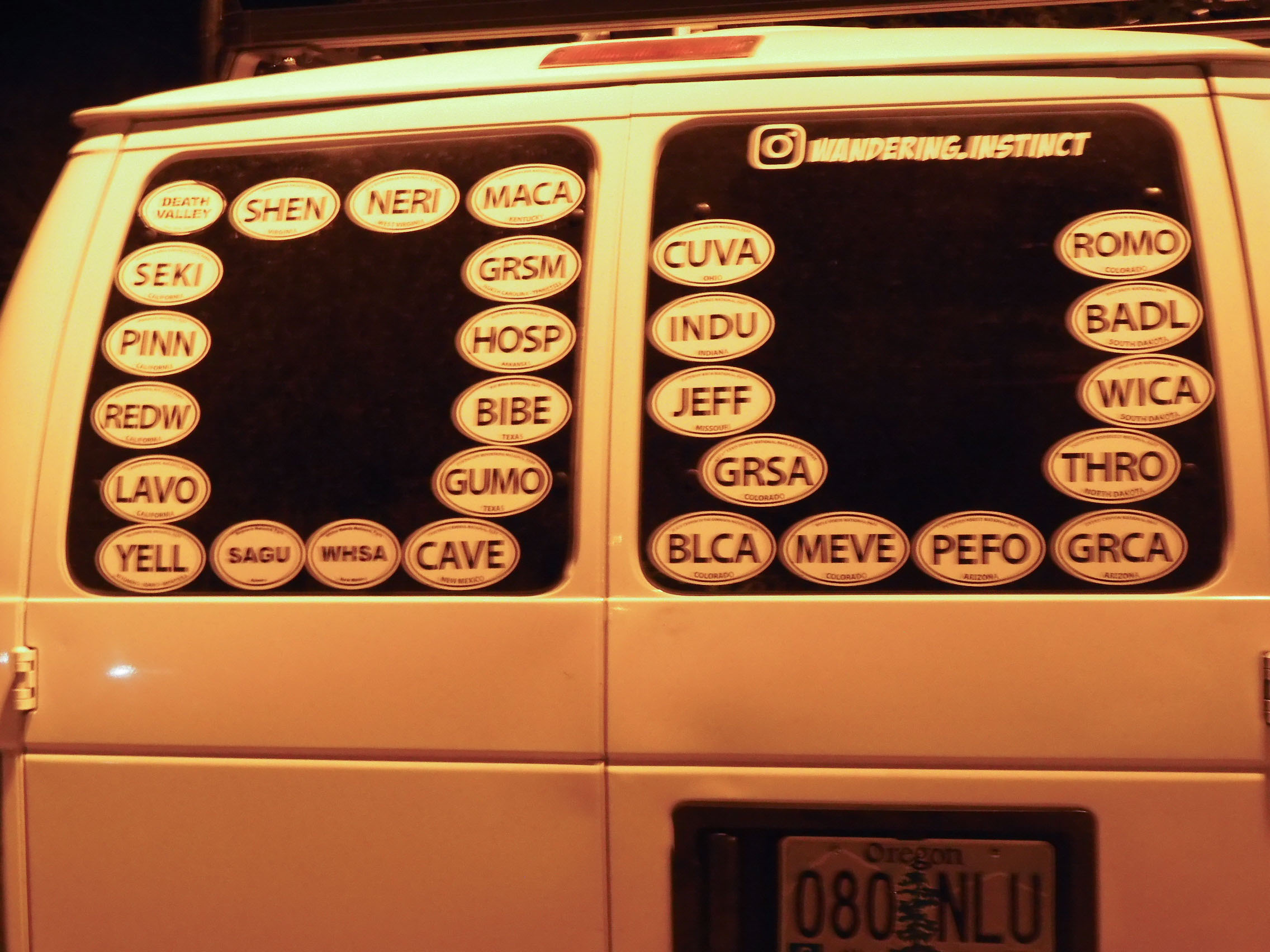 On a national park trip, you encounter other national park nerds. Eric photographed the large number of park stickers the people with this van had accumulated. Note that, other than Death Valley, which has the full words spelled out, all of their stickers use the proper National Park Service abbreviations for the parks. All too often, you see stickers that have "NP" for "national park" on the sticker. How are you supposed to distinguish Yosemite from Yellowstone that way? Eric disapproves, however, of the way these people have blocked the view out of their back window.