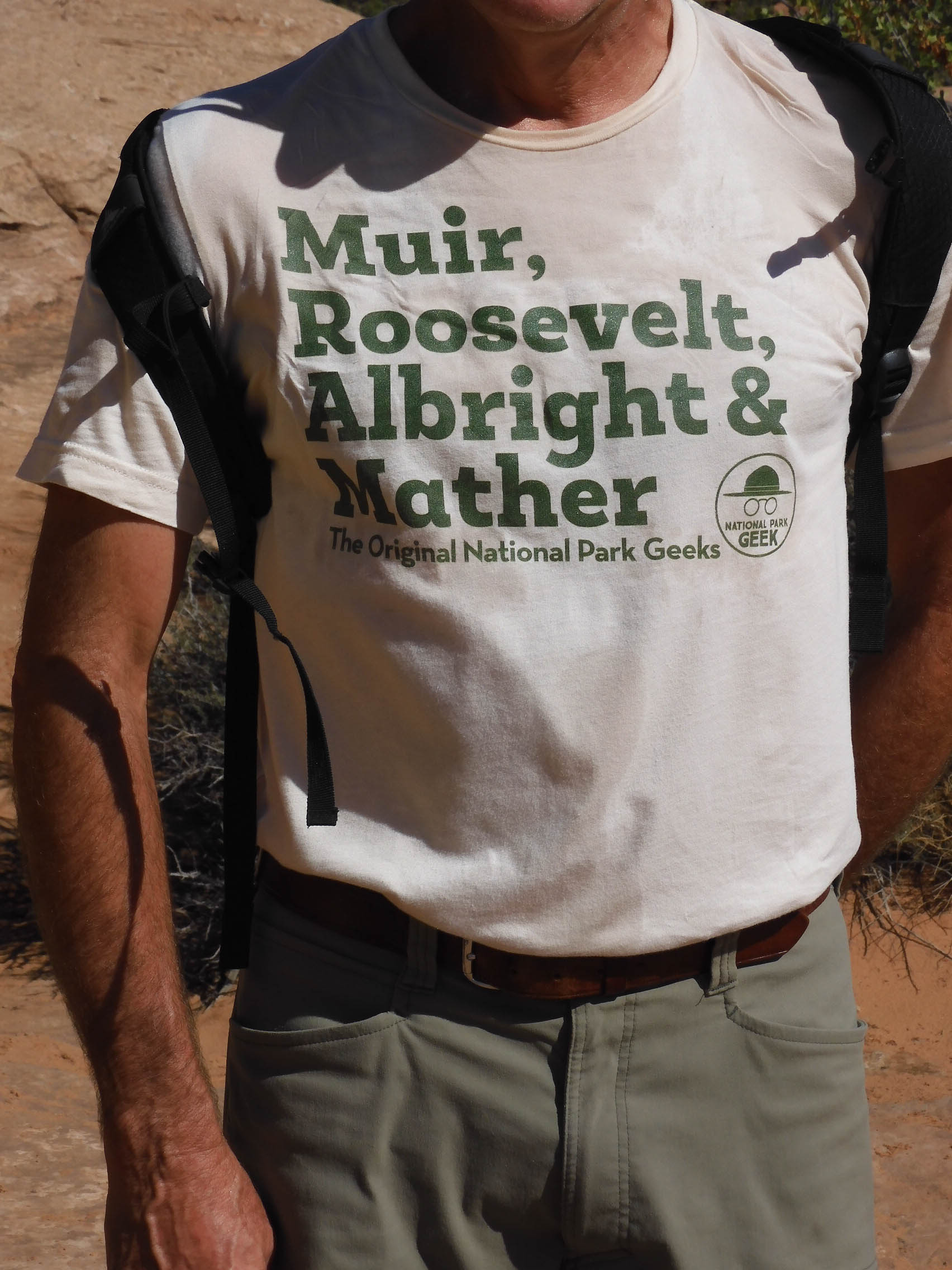 We met a park geek with a park geek t-shirt on the trail up to Delicate Arch. He let Eric photograph his shirt. Not too many people know that Mather was the first director of the NPS, but even fewer know that Albright was his deputy director. Mather was incapacitated by his bipolar condition through much of his tenure as director, and Albright loyally performed most of Mather's duties and covered for him. Both of them were Cal Berkeley alumni. [http://npshistory.com/brochures/whsa/mather-albright-2012.pdf & https://www.psychologytoday.com/us/blog/the-guest-room/201803/the-triumph-manic-mather]