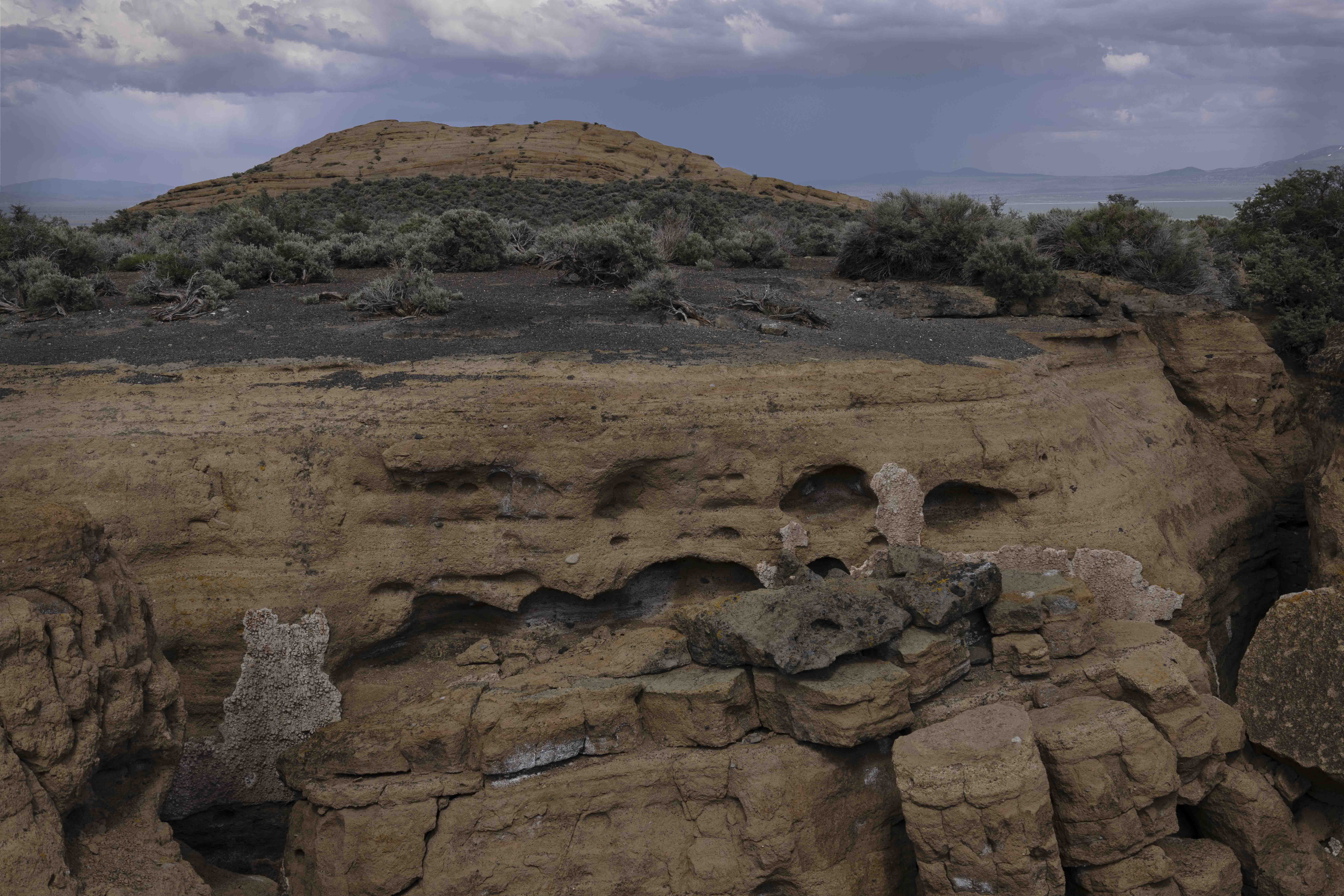 Black Point is a 13,000-year old volcano that erupted under a glacier. The eruption boiled the water immediately above it, shaping the lava into unusual formations. A Forest Service sign said that such a volcano exposed in this way on the surface may be unique on Earth. Black Point has fissures whose origin is not fully understood. As Black Point is right on the northern edge of Mono Lake, there are dramatic lake views from the summit. [Information compiled from US National Park Service informations signs and Geology Underfoot in Yosemite National Park, Glazner & Stock]