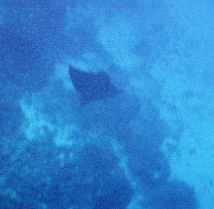 We picked up our tanks from the shop where they were being refilled and drove to a second site at the harbor that the manta ray boats leave from. It was quite a new and unusual experience hiking over lava rocks, and it was certainly novel (and difficult!) to hike over lava rocks in SCUBA gear! Everything was fine once we got into the water, though. We went down to 86 feet, and saw more of the clumps of coral in the more shallow water and the sheets of it deeper down. The goal of the dive was to see an spotted eagle ray, and we did see one. Smaller than a manta, and mostly black with little white spots on his back. He was beautiful! It was particularly great to see him because his is a near-threatened species. You can't see him too well here, but here he is.
