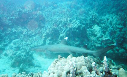 We also saw a reasonably-sized shark -- a 6-foot whitetip reef shark. Now, when I say he's six feet, he's really still quite a bit smaller than a human, because a lot of his length is in his tail. Also, he's not as big around as an average adult human. We didn't get very close to him, though.