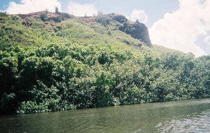 The general plan for visiting the Wailua River is to paddle an easy 2-miles out to a small island, leave your boat on the island, ford the river to get back off the little island, and then hike about a mile to the not-so Secret Falls. Most people take guided tours. The paddle was indeed easy and certainly lovely, and it was great to be out on the water enjoying the scenery.