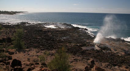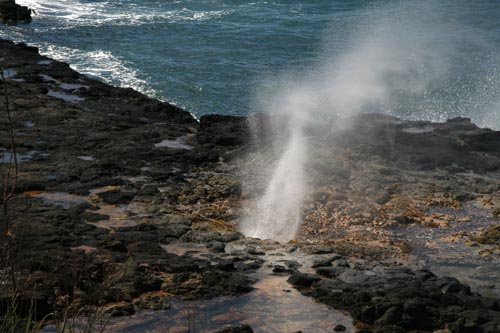 Nearby was Spouting Horn, marked in the Ultimate Guide as "not to be missed." This is a vent in some rocks where the waves spout up. The water underneath the rocks also makes a wonderful sighing and moaning sound. We also saw a sea turtle under the water here, but I couldn't get a good picture of it. There were geocaches in the area, but we decided we needed to skip them and press on if we were going to see the next sight.