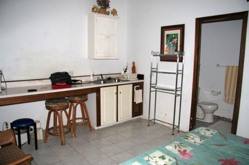 Last night, we checked into our Classic Cottage in Kalaheo. I found this place in the Rough Guide, and it's amazingly cheap, especially for Kaua'i: $45/night. It's not on the beach, but it is pretty closes to the main road, which I thought would be an advantage for our planned activities. The room isn't all that much, but it's certainly good-sized and serviceable, and it has a kitchenette, which is highly convenient.
