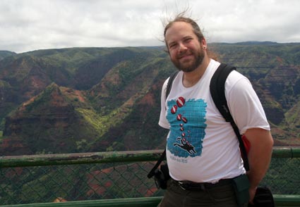 After tomorrow's thankfully much more sedentary adventures, we have one more day on Kaua'i. I had originally planned to spend it back in Waimea Canyon and Koke'e Park, as our dive buddy Walter had said it was worth two days. But then my brother said that we really should see the Na Pali Coast on foot as well as from the boat, that it was some of the most spectacular hiking he'd done in his life (and he's done a lot). But I've heard from other people that that trail is really muddy, and after today, Eric and I don't particularly want to look at any more mud. Near the end of the trail, we stopped to talk to some other hikers from Seattle. They told us that the Na Pali Coast trail has been closed due to a forest fire. So, that narrows our choices somewhat. We are now planning for a less strenuous day, especially since we have to get up very early the next morning to catch our 8:30 flight for the Big Island. We had been considering a kayak trip along the Wailua River, and these Seattleites, who had been to Kaua'i several times, told us that that was an amazing trip. I had also heard good things about it from Walter. So, now that's our plan for Tuesday. No more mud!