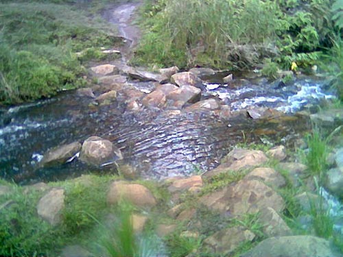 We went down the stairway (about 300 feet), along some more boardwalks, and eventually forded the stream. I only have a poorly-resolved cell phone camera picture of it, because I had run down the camera battery and forgotten to bring the spare! This was highly disappointing.