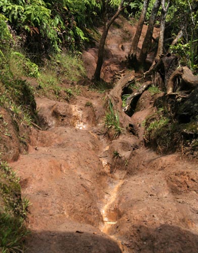 We made our way, up and down, through the mud. Eric was trying to stay relatively clean and picking his way very carefully. I figured it was a lost cause. He had also cut his toe badly while looking for the geocache near the Koke'e Lodge, and the cut toe hampered his progress throughout the trip. I disinfected and bandaged it, and he was very good about managing with it.