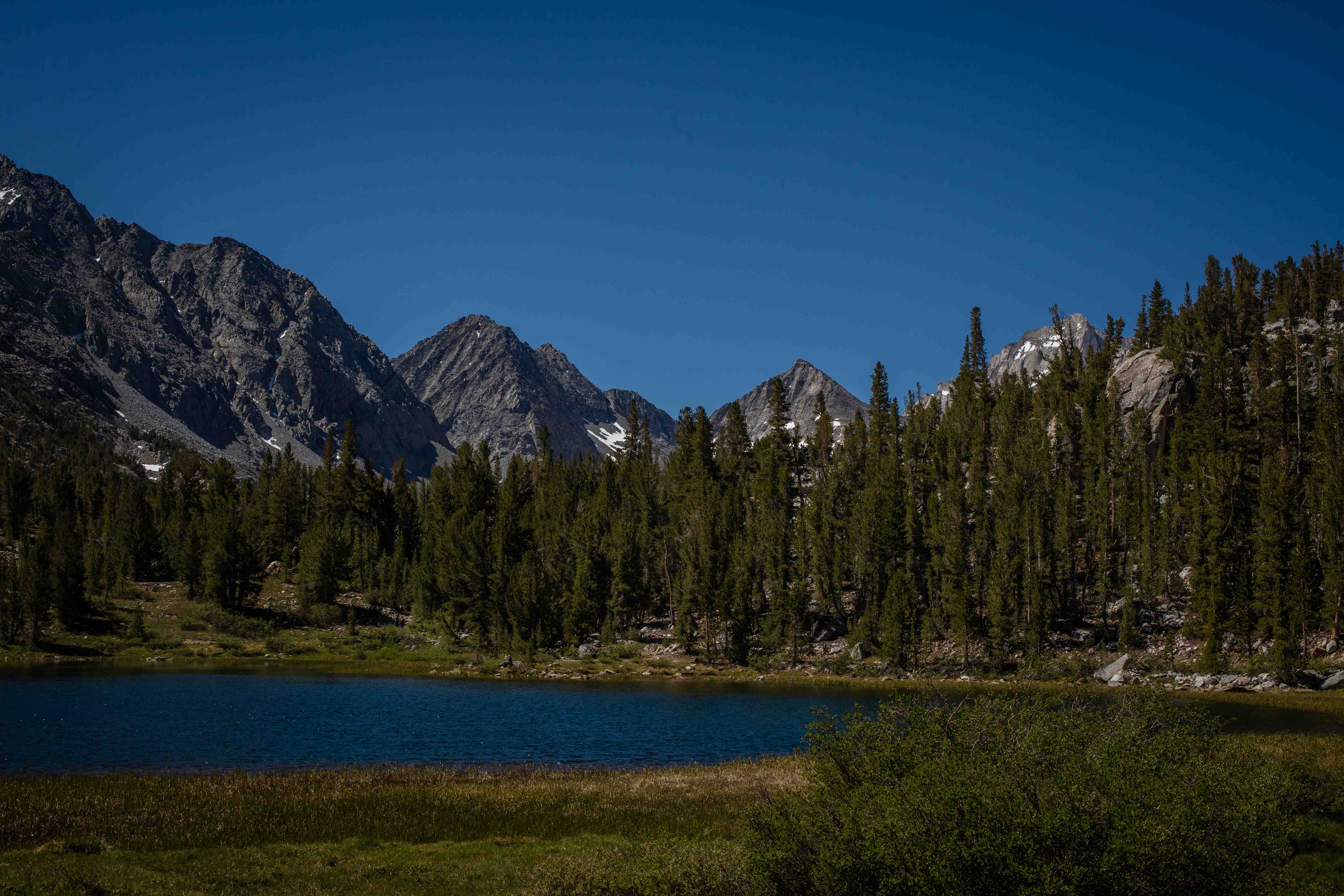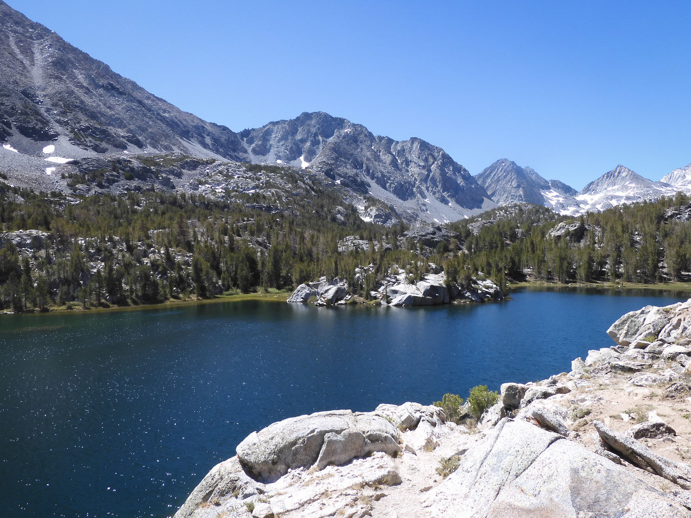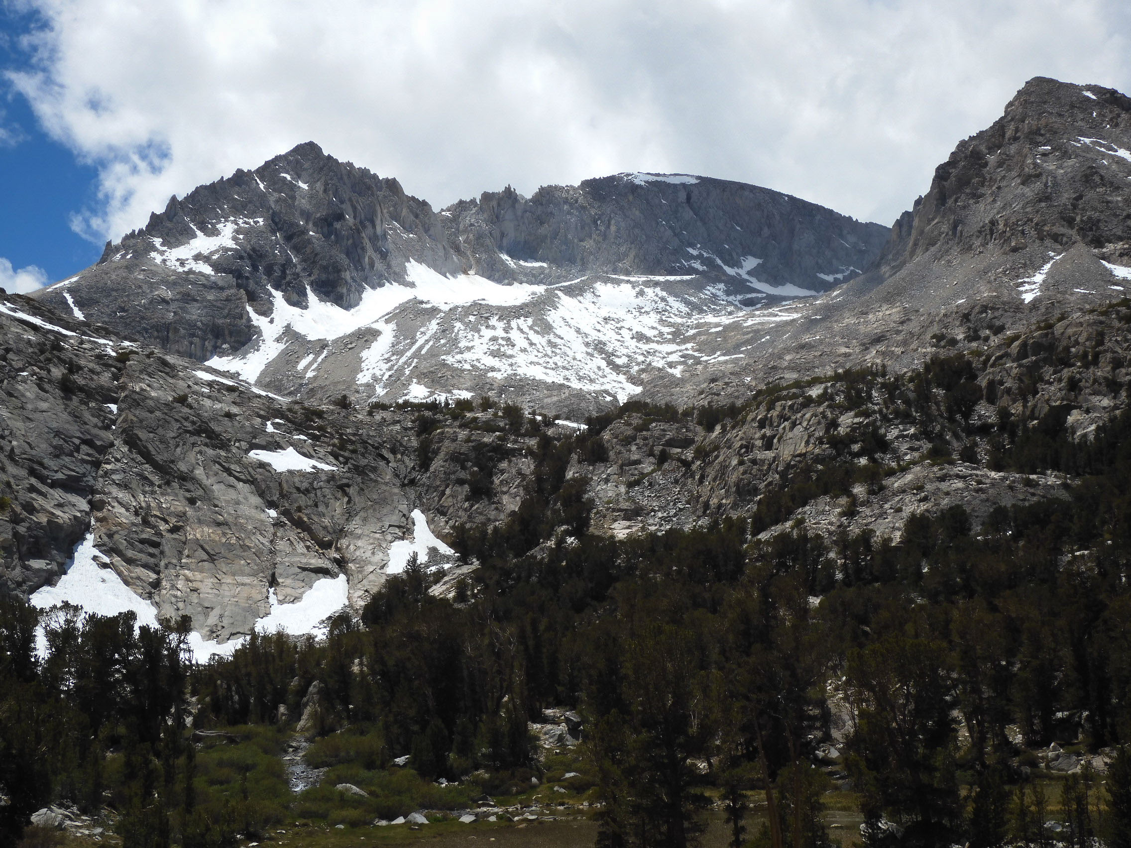 Our route took us past the leftmost mountain (which we think is Mt. Morgan) and nearly up to the patch of snow at the foot of the next mountain beyond (which we think is Bear Creek Spire, with Mt. Dade to the right). View from Heart Lake.