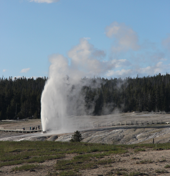 The rangers told us that the next predicted eruptions were the Grand Glacier, at 18:40 plus or minus 30 minutes, or Old Faithful at 18:58 plus or minus ten minutes. We didn't think we could see both, and, although the Grand Glacier eruption would be more dramatic, we couldn't very well say we went to Yellowstone without seeing Old Faithful erupt. We decided to walk around for a bit and come back for the Old Faithful eruption.