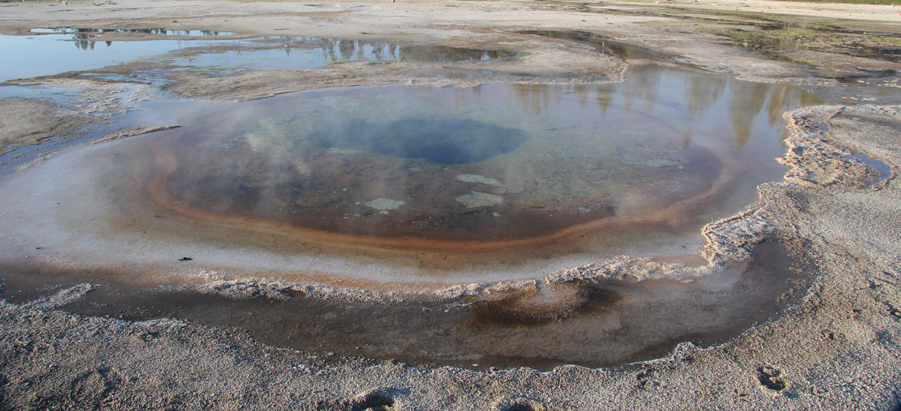 We had been seeking out Chromatic Pool specifically, because we had seen pictures of a feature that we thought was Chromatic Pool. We found out later that that feature had actually been Grand Prismatic Spring, a little ways further up the road. But when we got to Chromatic Pool, expecting something much more colorful, we were highly disappointed, and assumed that all the pictures we had seen had just been heavily Photoshopped.