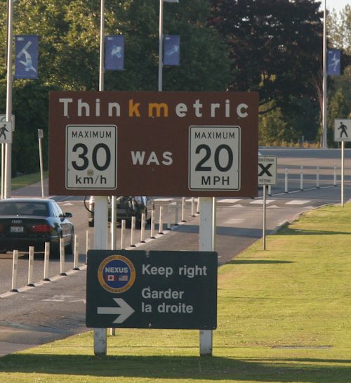 They had a sign reminding you that Canadian speed limits are in metric. I wish everyone would "think metric" all the time; it makes so much more sense.