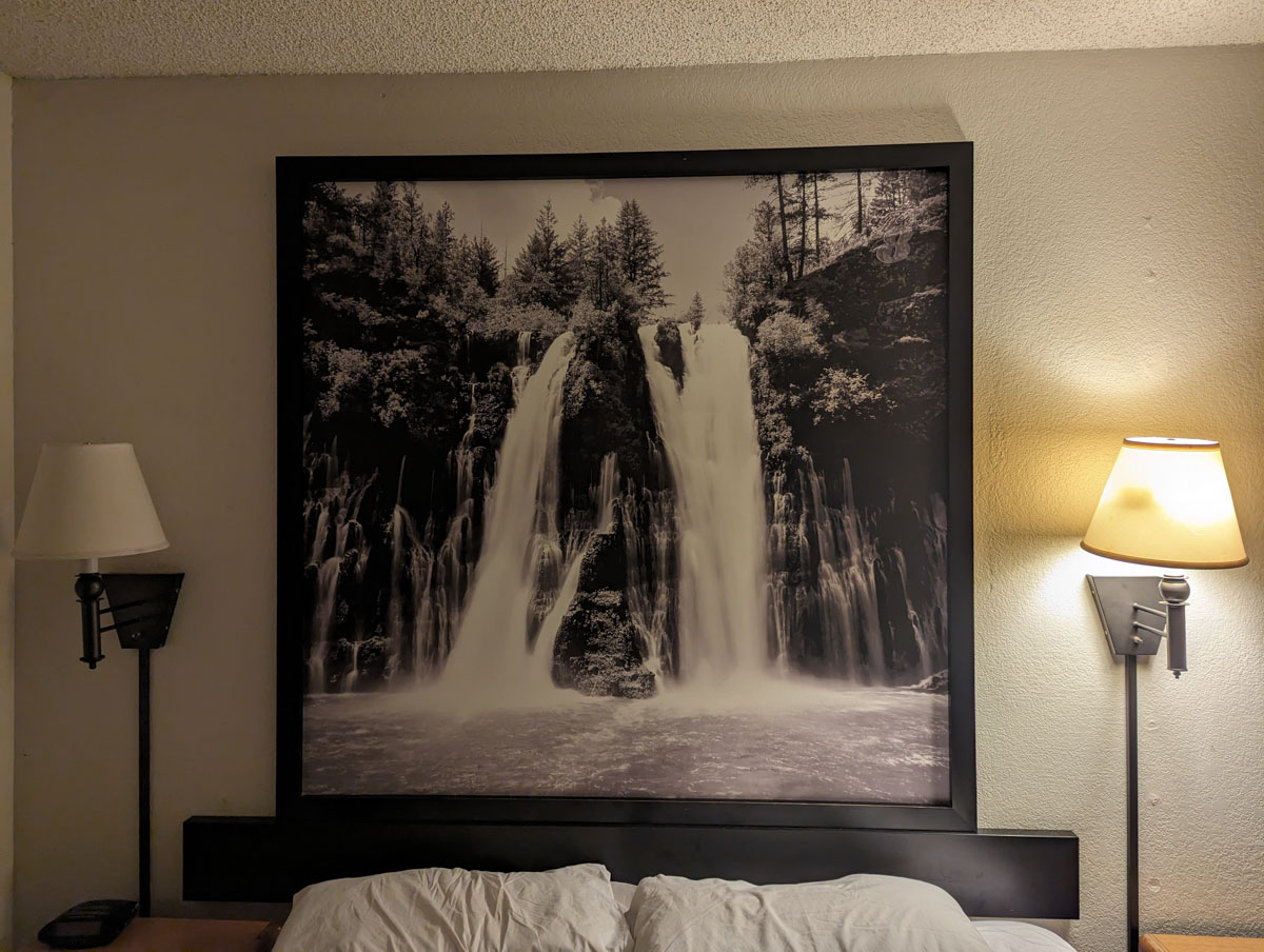 As you may know, after we stayed in a motel room in northeastern Oregon in 2015, and the walls of the room had photographs that were clearly Yellowstone and Vernal (in Yosemite) Falls, I now examine motel art to see whether or not it shows the local area, as opposed to faraway scenes. So, I wholeheartedly approved of this lovely photo of Burney Falls at the Super 8 in Red Bluff. Burney Falls is a 1:45 minute drive from Red Bluff, so perhaps closer Mossbrae Falls would have been better, but this at least was a nice photograph of the general geographic area.