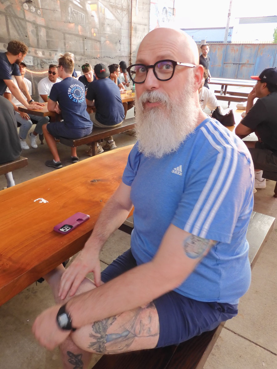 At the Asylum, we had a teriyaki chicken sandwich and a piece of fried chicken on a waffle. We forgot to take a group picture, but Eric took pictures of our friends. This is Scott, who plays Monster of the Week online with Eric, and whom we were meeting in person for the first time.
