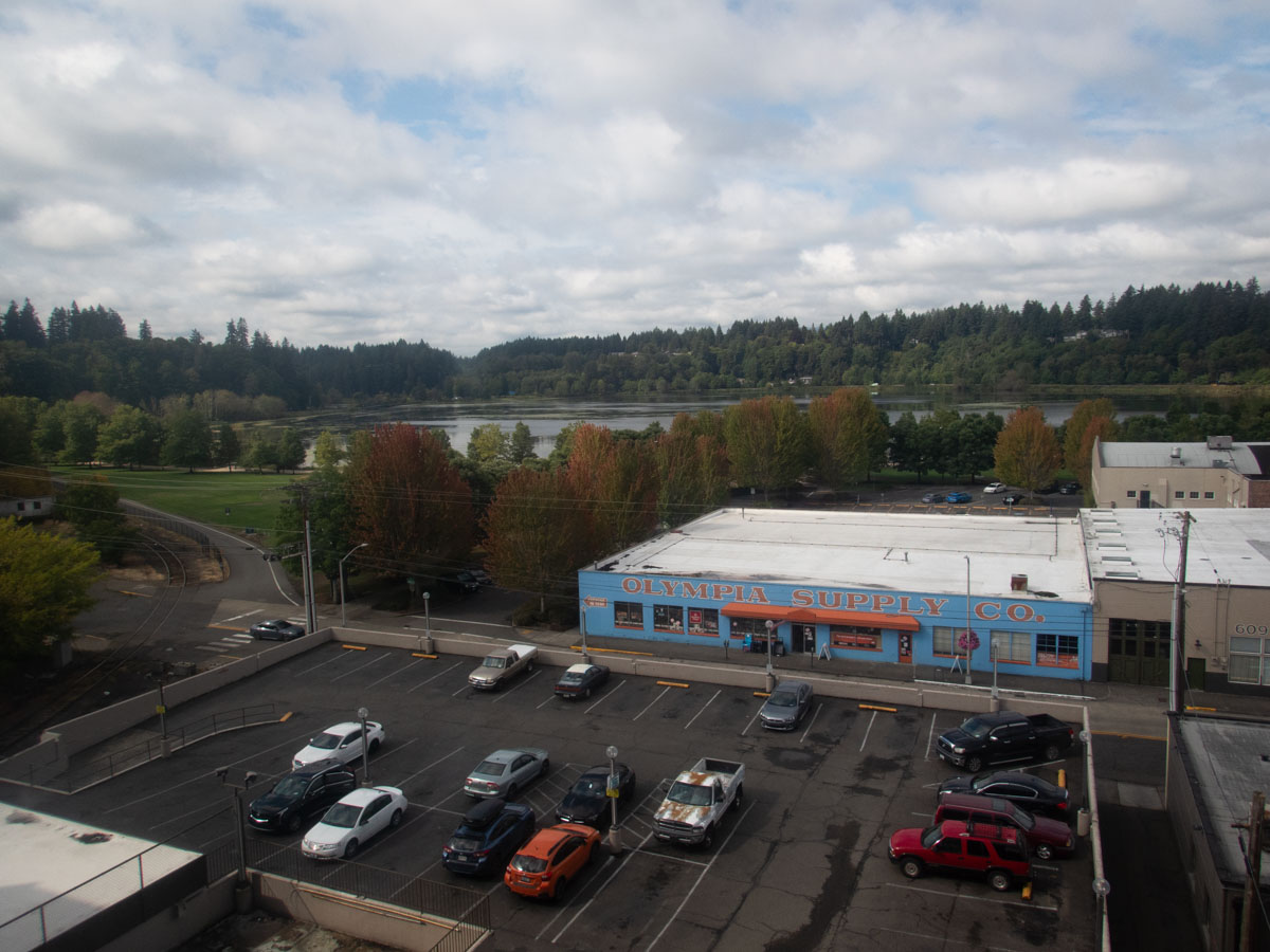 The road was forested and lovely. There were a couple of traffic slowdowns for some tree trimming to protect utility wires, nothing horrible. We poked into a couple of state parks, but didn't find them interesting enough to stop. I thought maybe we could get a nice sit-down dinner in Olympia and have a relaxing evening.
