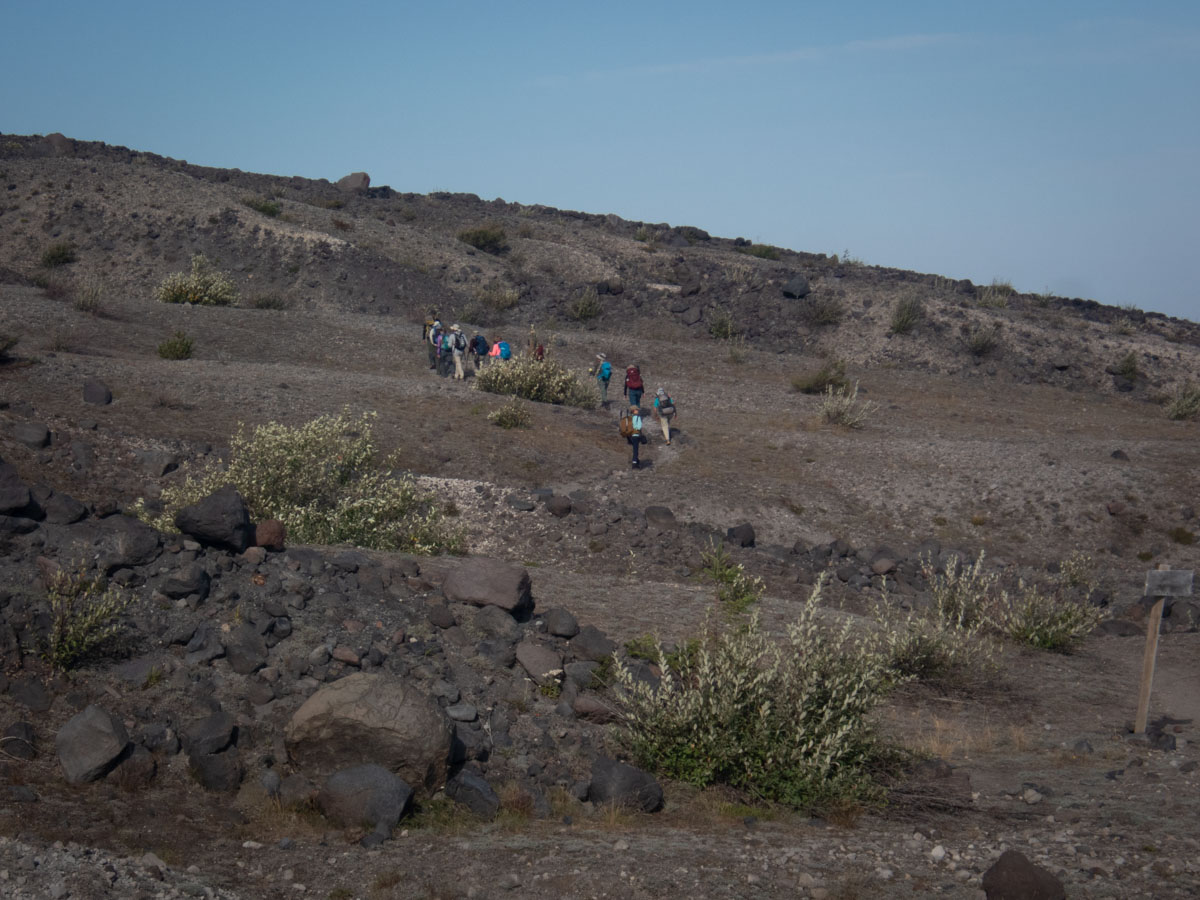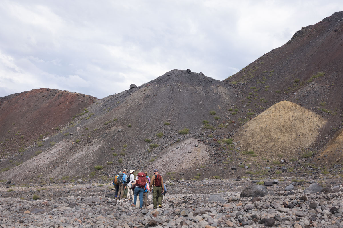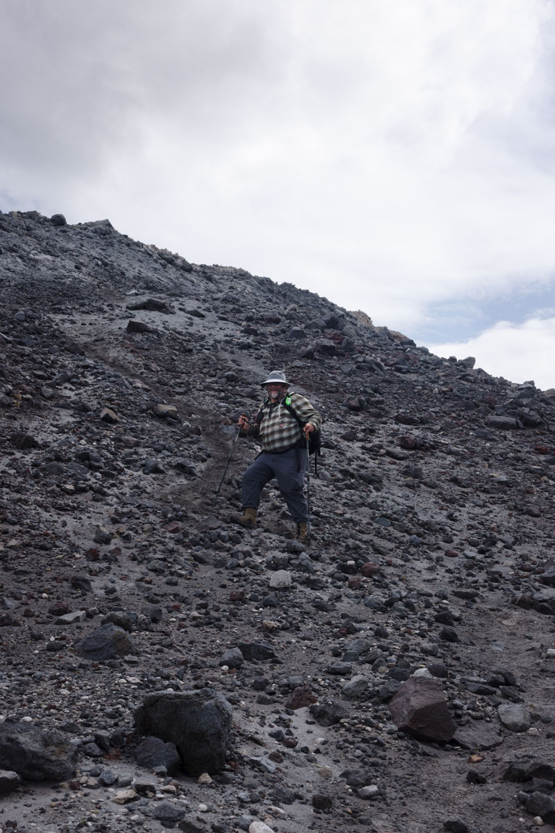 We met our insightful geology guides, Cynthia and Willie, both of whom had worked for the US Geological Survey. Willie had arrived at the mountain days after it erupted (after having been their earlier and been unable to stay) and observed the effects of the destruction. Cynthia had come later and done original research at the site, analyzing samples drilled from rocks and dating sections of the site based on the magnetic polarity of the samples. Cynthia and Willie were both now retired, but Willie said he thought he had one more hike into the crater in him.