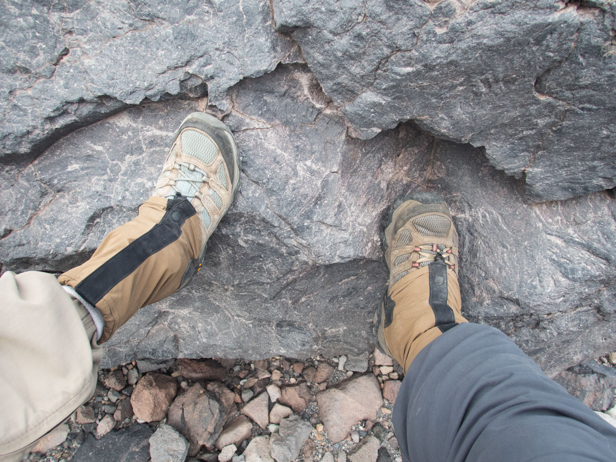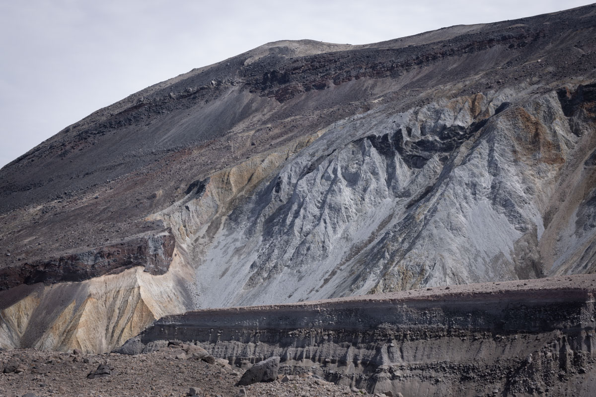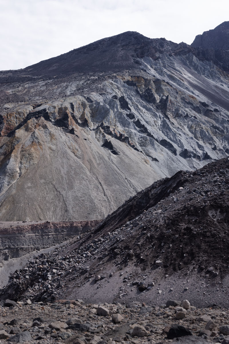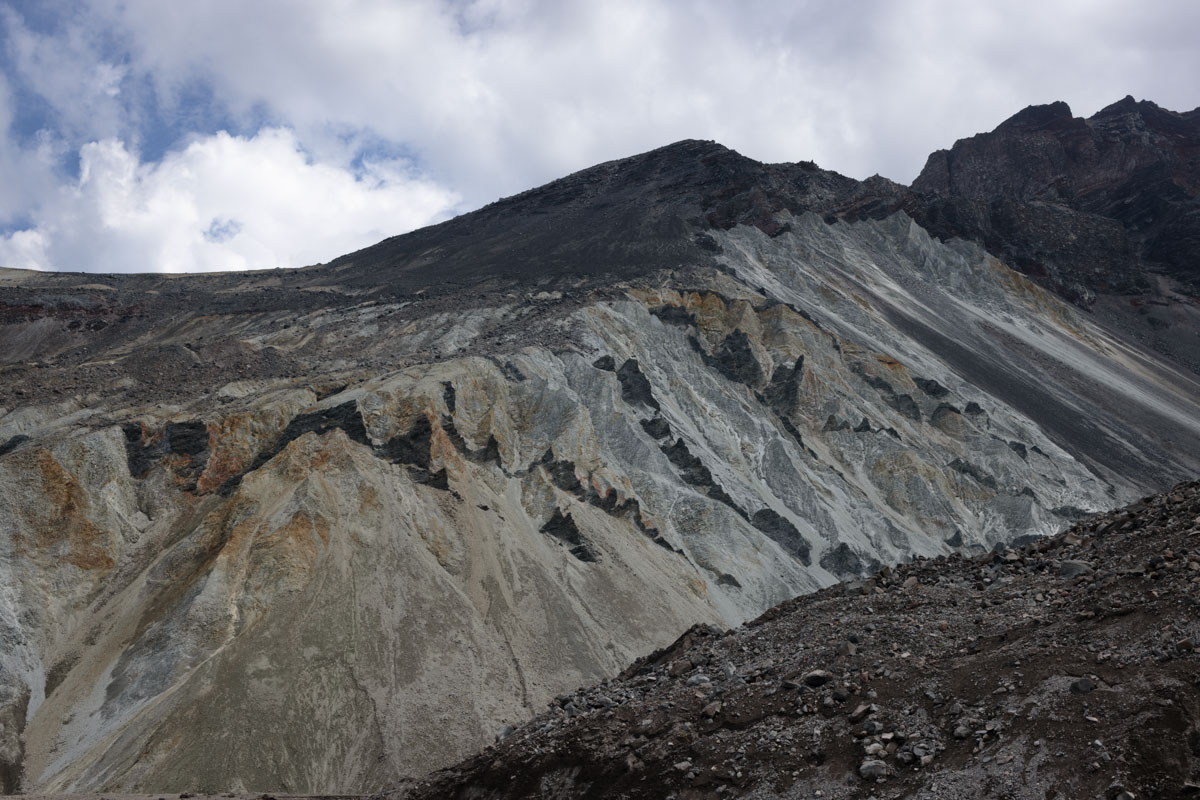 We met our insightful geology guides, Cynthia and Willie, both of whom had worked for the US Geological Survey. Willie had arrived at the mountain days after it erupted (after having been their earlier and been unable to stay) and observed the effects of the destruction. Cynthia had come later and done original research at the site, analyzing samples drilled from rocks and dating sections of the site based on the magnetic polarity of the samples. Cynthia and Willie were both now retired, but Willie said he thought he had one more hike into the crater in him.