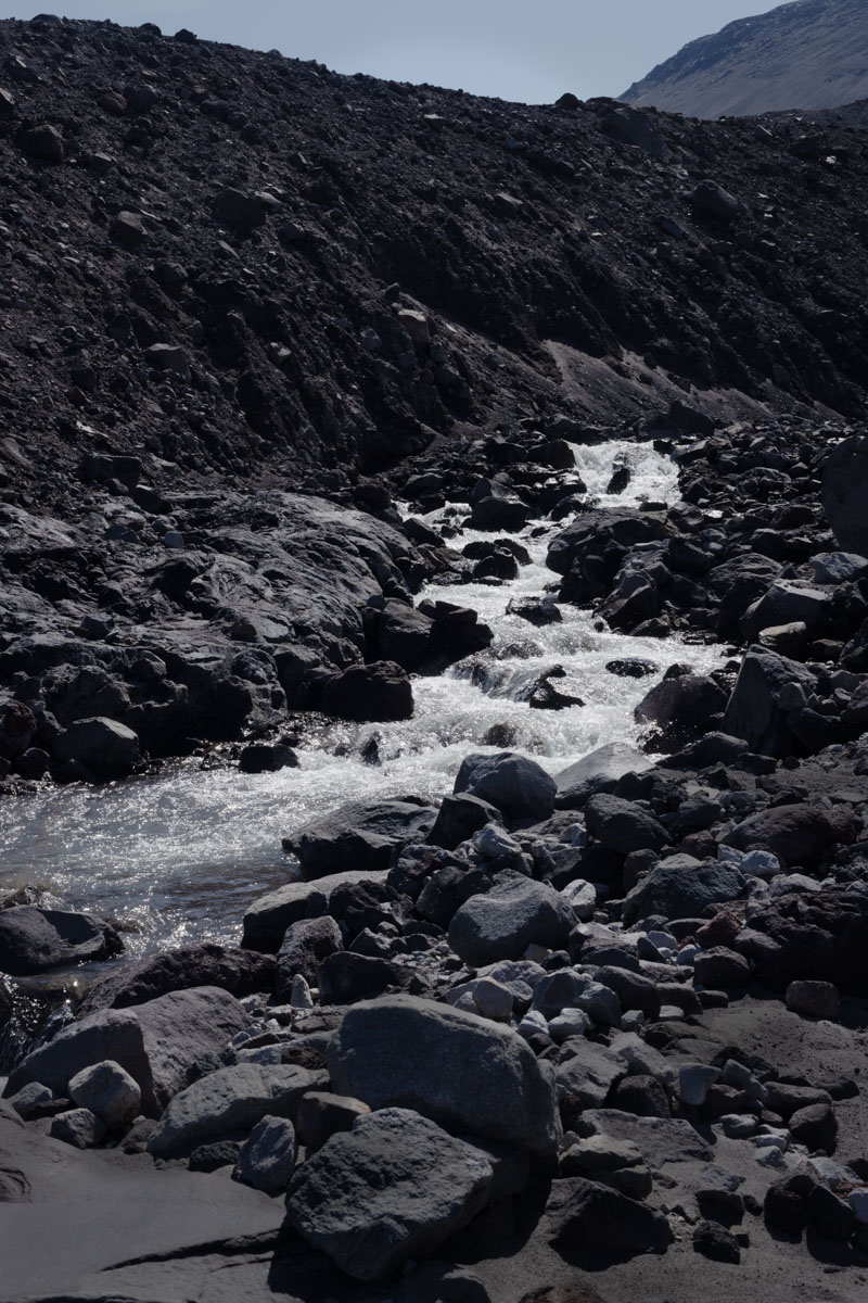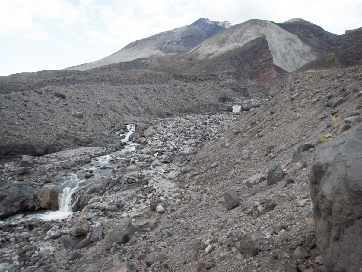 The stream bubbled along through the volcanic debris.