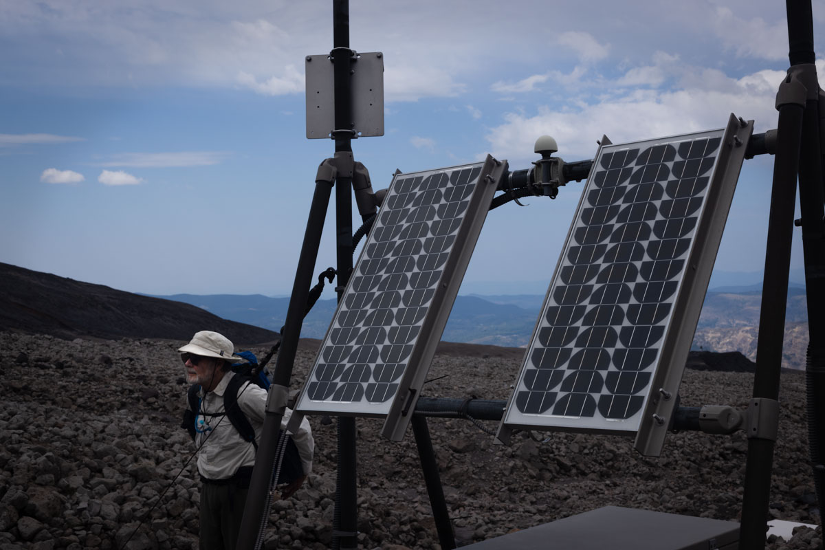 Willie standing beside a seismic monitoring station. As the ridge erodes, the USGS keeps moving the monitoring station, but they are running out of space to relocate it.