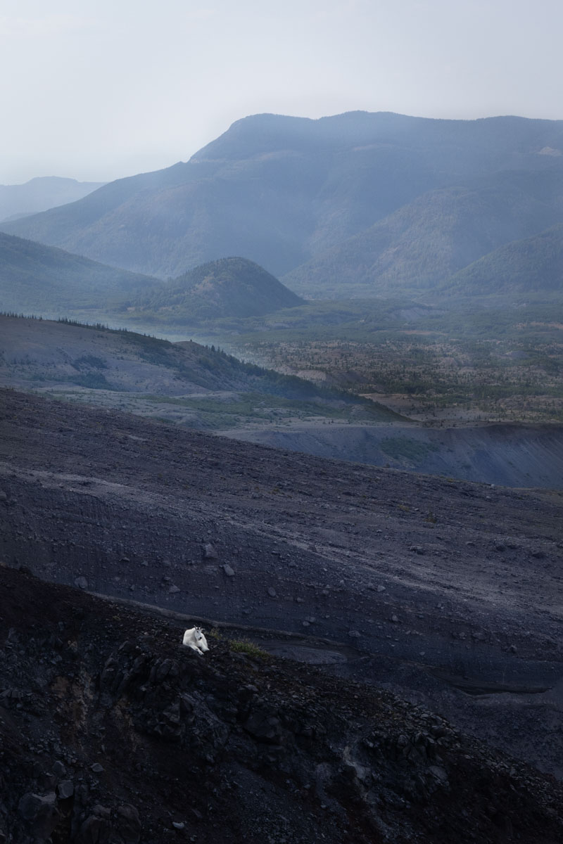 Goat relaxing and watching hikers from a ridge of the volcano.