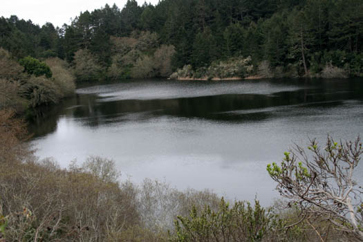 The trail turned back toward the ocean, climbing a hill and passing two lakes. This is Bass Lake, the smaller of the two.